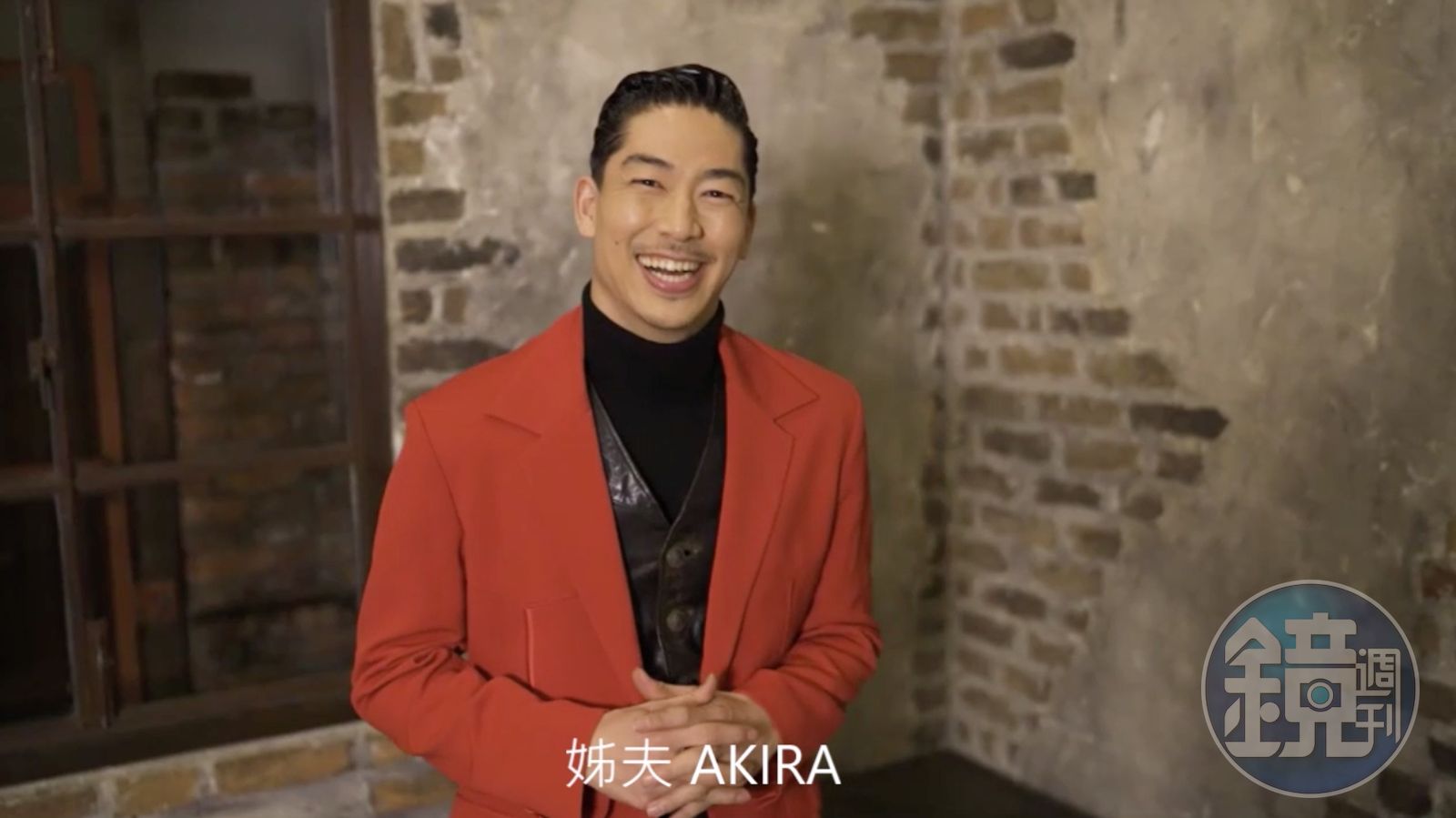 AKIRA與林志玲在2019年結婚。(LDH Taiwan提供)AKIRA在影片中全程使用中文,自我介紹的頭銜即是「姊夫」,說完還哈哈大笑,讓人感受到AKIRA的好心情,他表示由於疫情影響,使得他今年無法回台灣,祝大家2021年新年快樂;AKIRA吉祥話連發,「恭喜發財」「平安健康」講得非常熟練,也沒忘記新的一年是牛年,祝福大家「牛年行大運。」