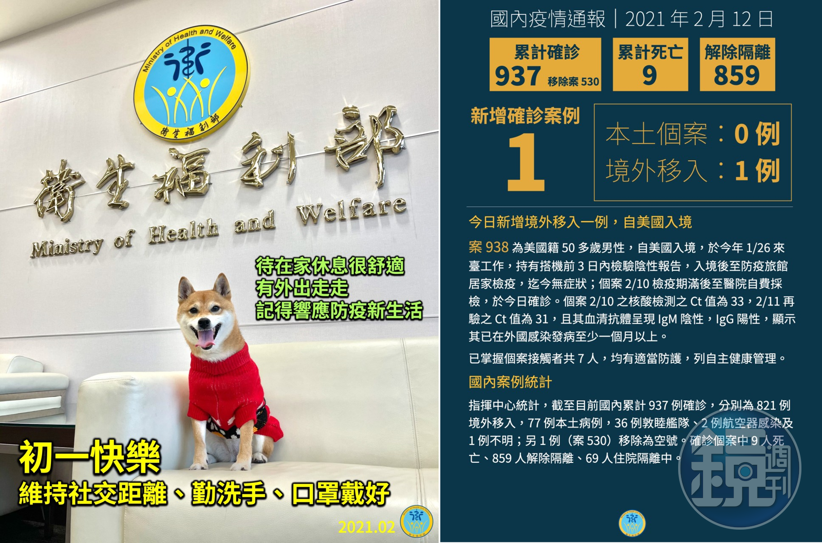 本日無本土案例,但新增1例境外移入確定病例(案938),為一名50多歲的美國籍男性。