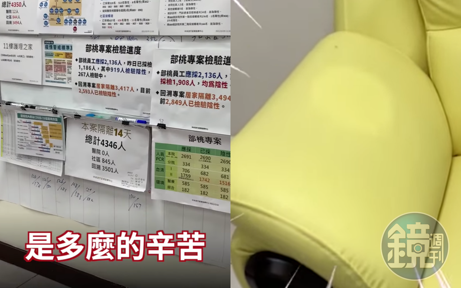 影片中可以看到,部長辦公室的沙發上有個頭型,是被陳時中睡出的痕跡,陳時中則笑稱,他也不知道怎麼睡的,「大概頭比較油吧!」辦公室的牆上貼有數個春聯,寫著「我愛加零」「無疫則剛」等字樣,並有滿滿的圖表,蘇貞昌表示,大年初一疾管署仍有30餘位同仁在值班,從辦公室牆上的圖表可以看得出,這一年多來是多麽辛苦,靠著大家配合才讓台灣成為全世界最安全的地方。