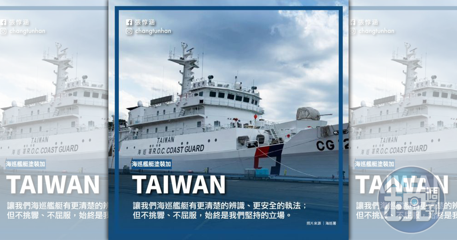 《聯合報》今天報導指出,海巡署日前在國安高層指示下,在海巡艦艇現有「R.O.C. COAST GUARD」上方增加「TAIWAN」字樣,現已完成新北艦、澎湖艦等數艦新制塗裝,後續尚有百餘艘大小型艦艇將視維修期程辦理塗裝。