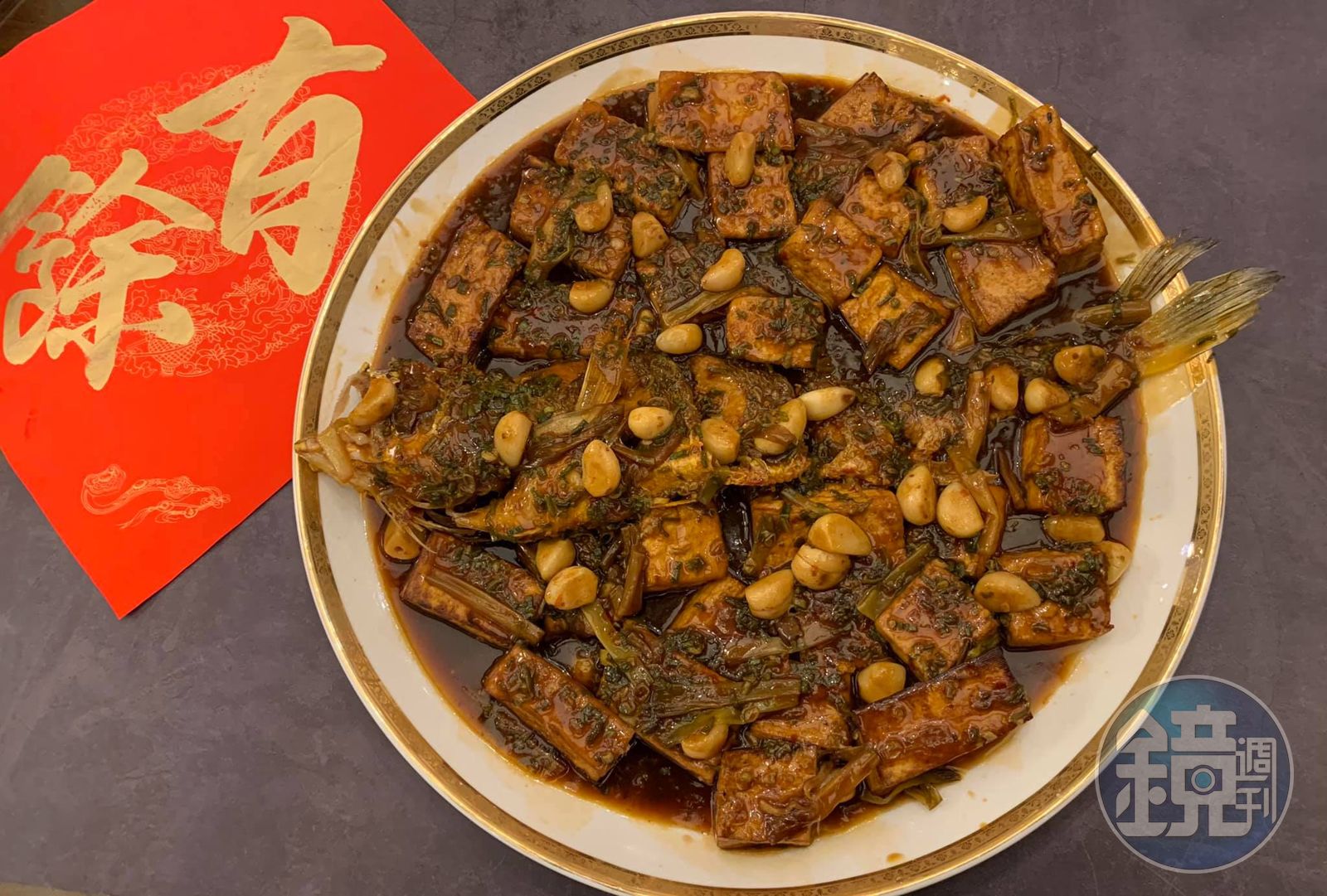 Step7:先將魚盛入盤中。再將鍋內豆腐逐一㚒出放魚兩旁。湯汁稍微勾芡,撒上青葱、青蒜,淋在魚上,澎湃上桌。這就是家傳的豆腐燒黃魚。