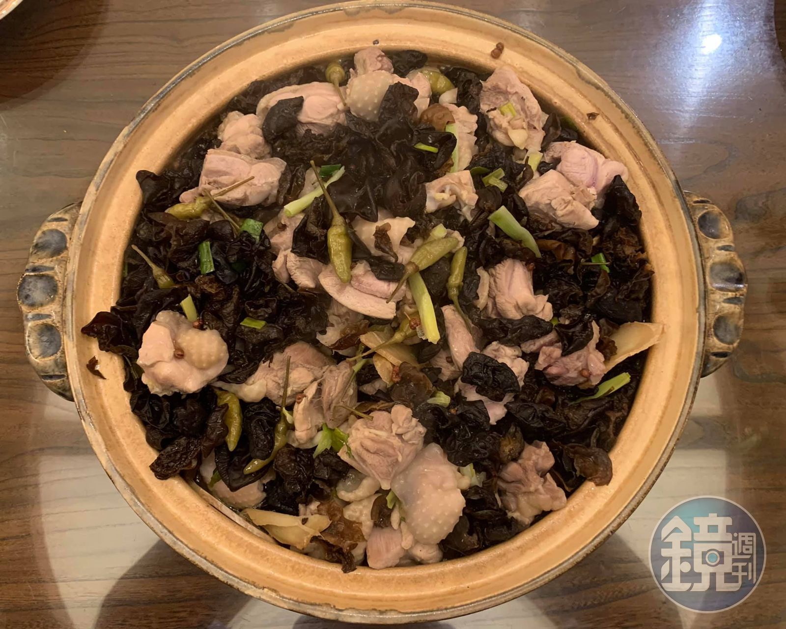 取一大鍋,炒香蔥、薑、花椒,下去骨雞腿肉,我加米酒、淡醬油及高湯調味,然後,拌炒均勻後,整鍋倒入砂鍋煲之。另起一鍋油炒木耳,加入整罐泡椒,加椒鹽調味,然後將此泡椒木耳倒入砂鍋,略拌一下,再煲個15分鐘,即完成木耳泡椒雞,酸辣辛香,木耳爽脆,雞肉特別軟嫩。我想泡椒出自四川、雲南一帶,所以今天用的木耳是小朶的雲耳。