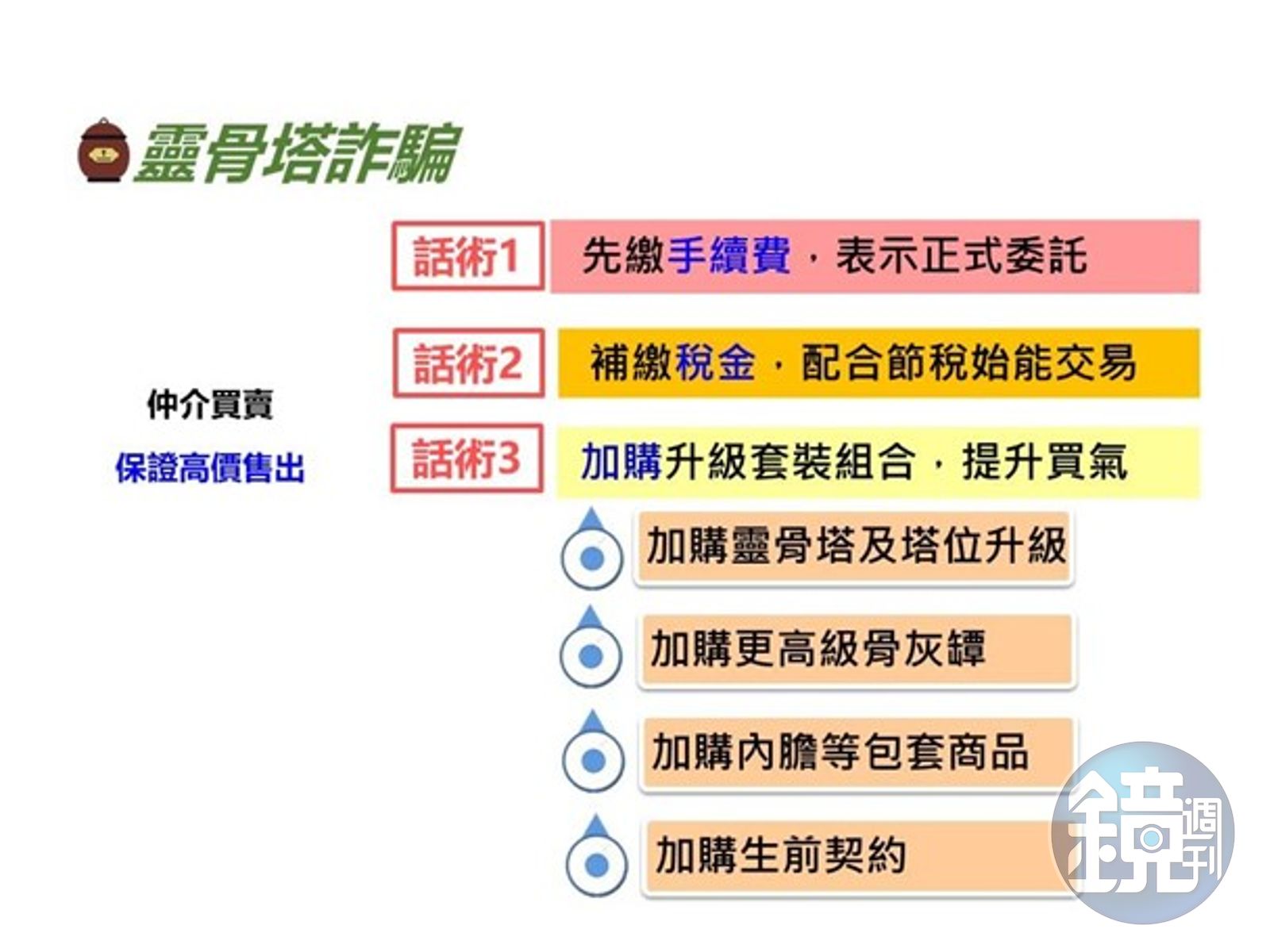 刑事局統計,今年年1月1日至2月4日,「靈骨塔投資詐騙」共發生18件,其中最高財損金額達1,600餘萬元,受害族群以退休、家管等年長族群為主,詐騙集團先以密集電話聯繫或邀約見面建立信任感,搭配乍聽專業可信、實則天花亂墜的話術,透過業務、仲介等人輪流遊說民眾,謊稱有買家因「八字合、風水好」等莫名理由,願高額承接塔位,此時詐騙集團再搭配販售高單價殯葬商品,或假藉節稅、套利、手續費等事由,結合不肖放款業者,誘騙被害人申辦高額、高利貸款,甚至抵押房產,直到最後發現財產有去無回才恍然大悟。