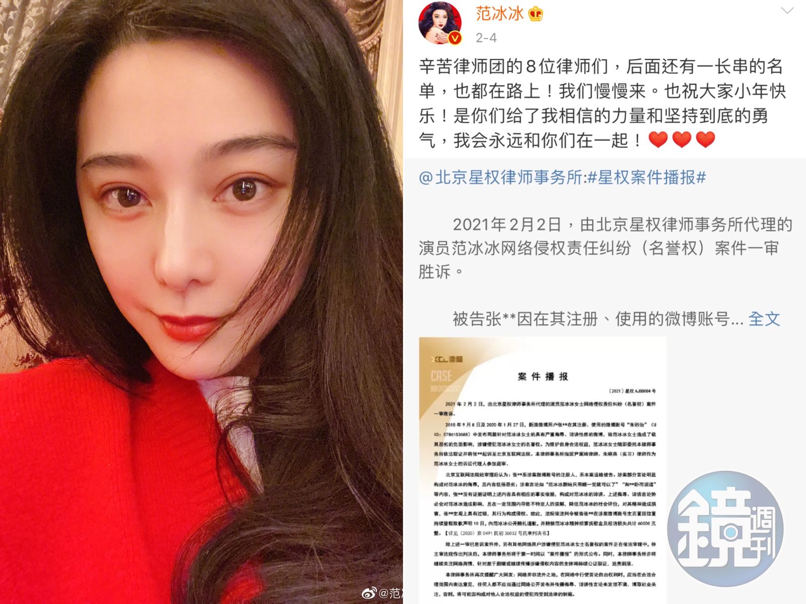 范冰冰在得知消息後,也轉發這篇勝訴貼文,她開頭先感謝辛苦的8位律師,並表示「後面還有一長串的名單,也都在路上!我們慢慢來。」許多網友見狀都紛紛表示支持,並希望范冰冰別再心軟,對於惡質的網友該提告就提告。或許因為勝訴關係,范冰冰過了一個開心的年,就連情人節也大方分享自己的情人節大餐,雖然不是什麼山珍海味,但這樣開心地慶祝是這兩年多來頭一回。