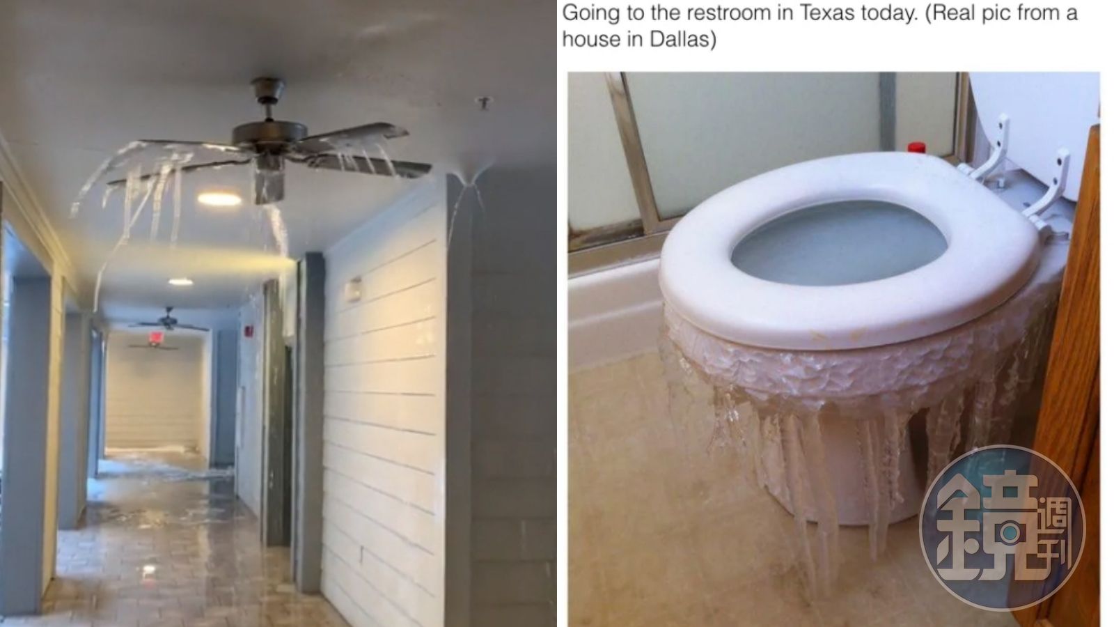 許多來自德州還有電可用的網友,這幾天紛紛上網回報自己所在地的情況,零下18度C的低溫讓家中的泳池變了溜冰場,魚缸也變成了大冰塊,水龍頭的水成了冰柱,馬桶裡的水也凍結成冰,更扯的是,還有人家中水管破裂,流出來的水落在天花板的吊扇上,竟也因此結冰,變成一根根尖銳的冰柱,相當驚人。