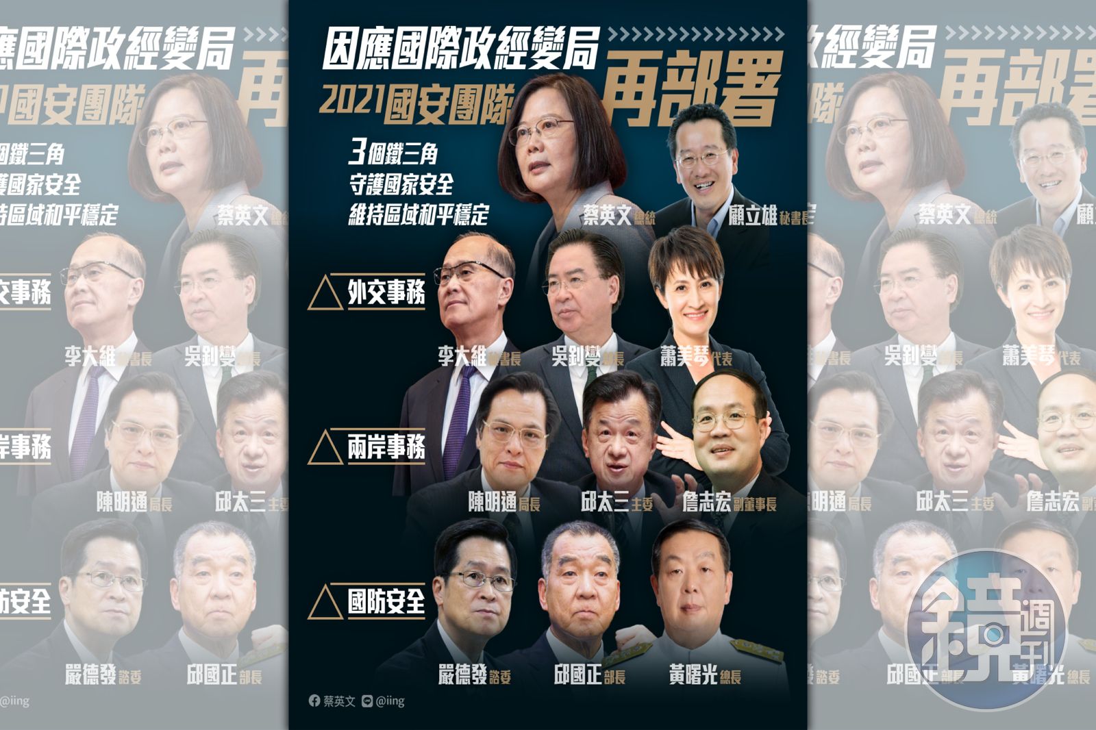 蔡英文稍早於臉書以「國安團隊再部署,三個鐵三角就位!」為題發文,表示針對新一階段的區域及國際情勢、後疫情時代下,所牽動的全球政經變局,國安團隊須進行任務與隊形的再部署。因此,總統府今日對外宣布新的國安團隊的新人事,包含新任國安會諮詢委員嚴德發、新任國防部長邱國正、新任國安局長陳明通、新任陸委會主委邱太三。