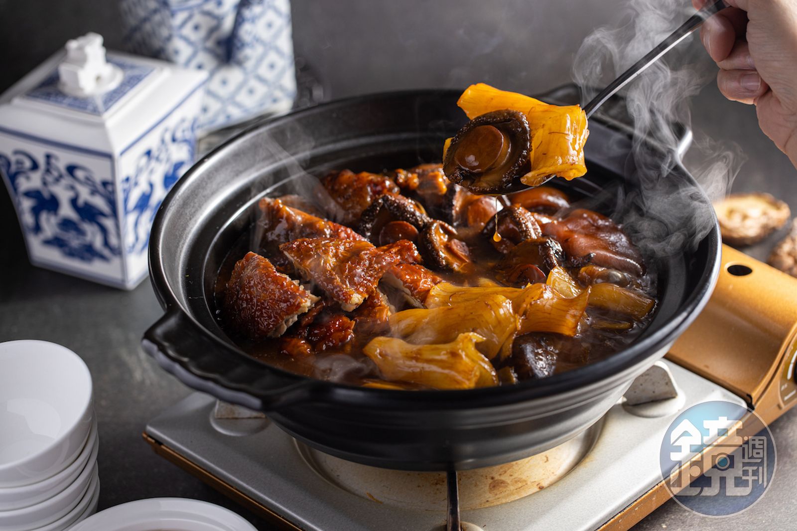 大盆菜「花膠鮑魚燜雞」就選用肉質肥厚爽滑的花膠、得費時發製的海參,再加蠔乾、豬腳、脆皮燒雞等食材燜燉,一大盆上桌,氣勢非凡,細炆的膠質香醇佔領舌尖。另一道招牌菜色「上湯焗龍蝦伊麵」,伊麵吸收了上湯龍蝦、紹興酒的滋味,燜到麵條稍軟入味,也是老饕吃法。
