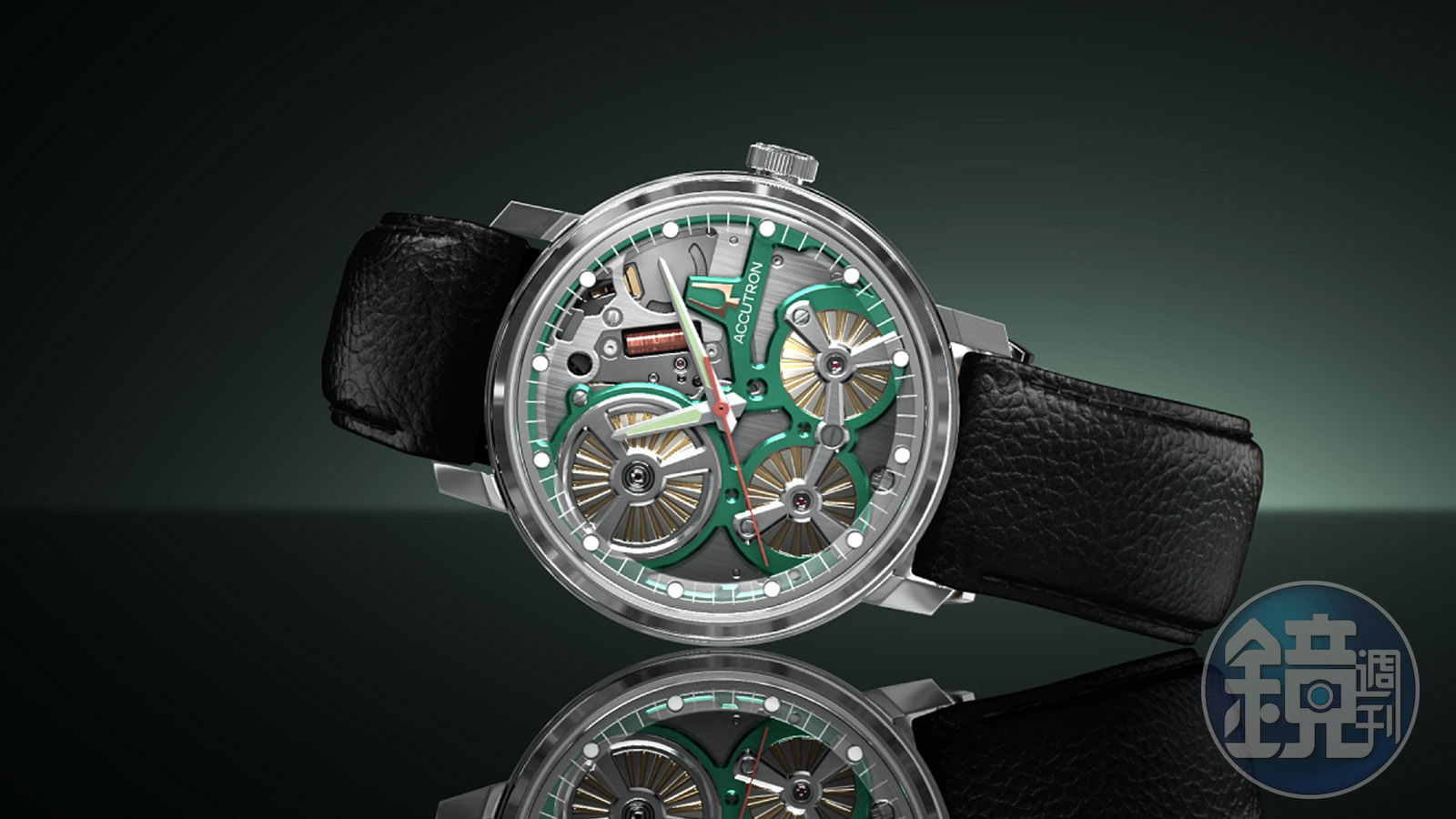 Accutron以靜電產生器提供的動能取代發條盒、也沒有傳統機械錶的輪系結構,所以不會有擒縱器運作的滴答聲,取而代之的是共振產生的嗡嗡聲。不過現在的Accutron DNA和Accutron Spaceview 2020已經沒有嗡嗡聲了,在結構和材料等細節做了修改,面盤設計也不一樣,十點鐘位置會轉動的渦輪成為視覺重點,像是看著心臟在跳動一樣,有種手錶正在呼吸的感覺,雖然這個時代不差一只新錶,但一只有歷史的新錶就又是另外一回事了。