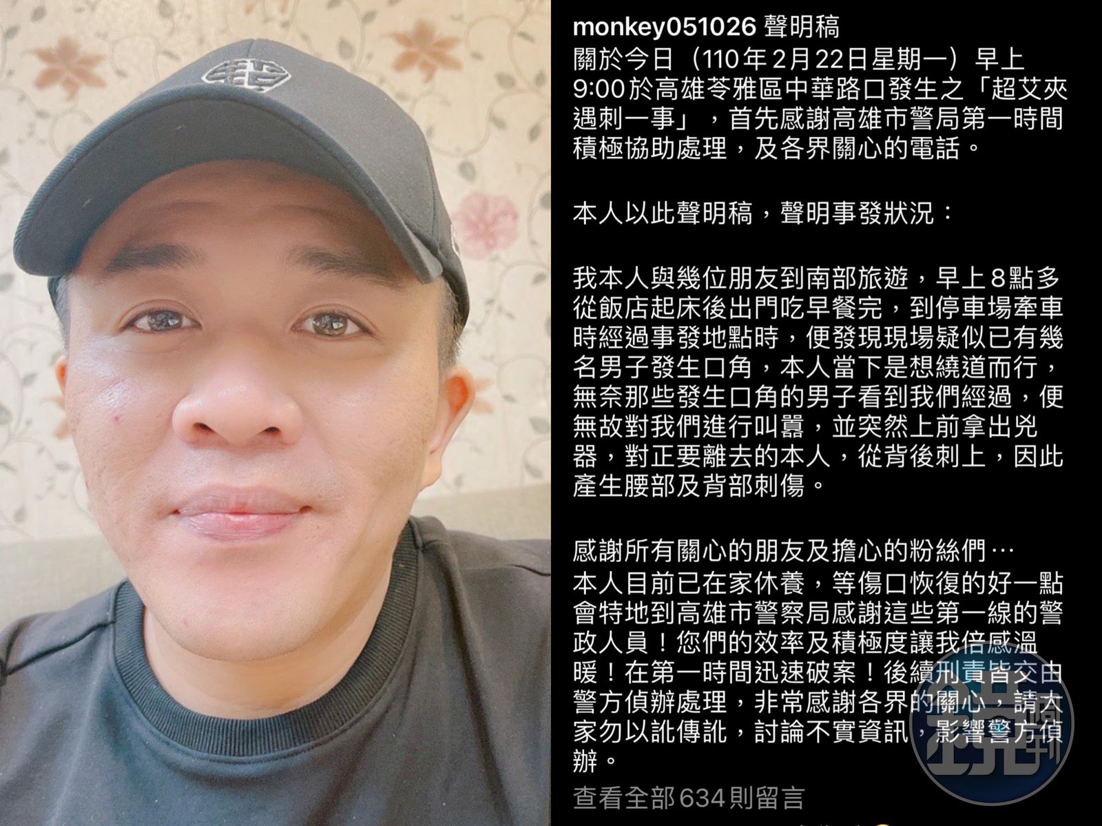 網紅「含羞草日記」副團長超艾夾昨(22日)早在高雄大馬路遇襲,背部遭刺2刀,所幸未傷及臟器,包紮後已返家休養。晚間他稍作休息後,也在IG貼出自拍照,並發出聲明報平安。