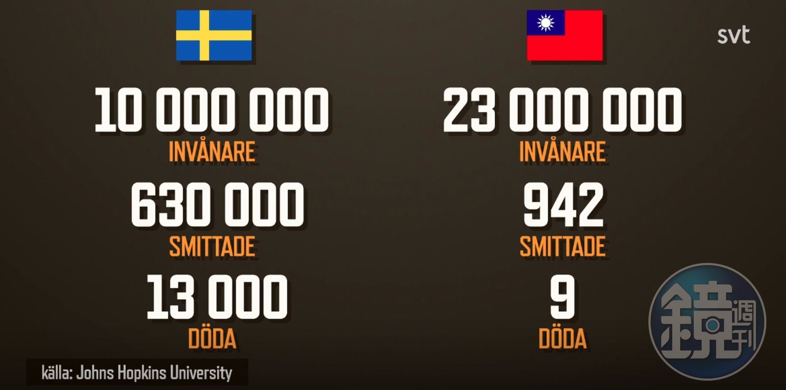 節目中指出,台灣的人口僅有瑞典兩倍以上,且距離病毒源頭中國只有120公里,卻只有不到千例感染和9個死亡案例。也引發截至目前有6.3萬確診病例、1.3萬死亡病例的瑞典高度關注。