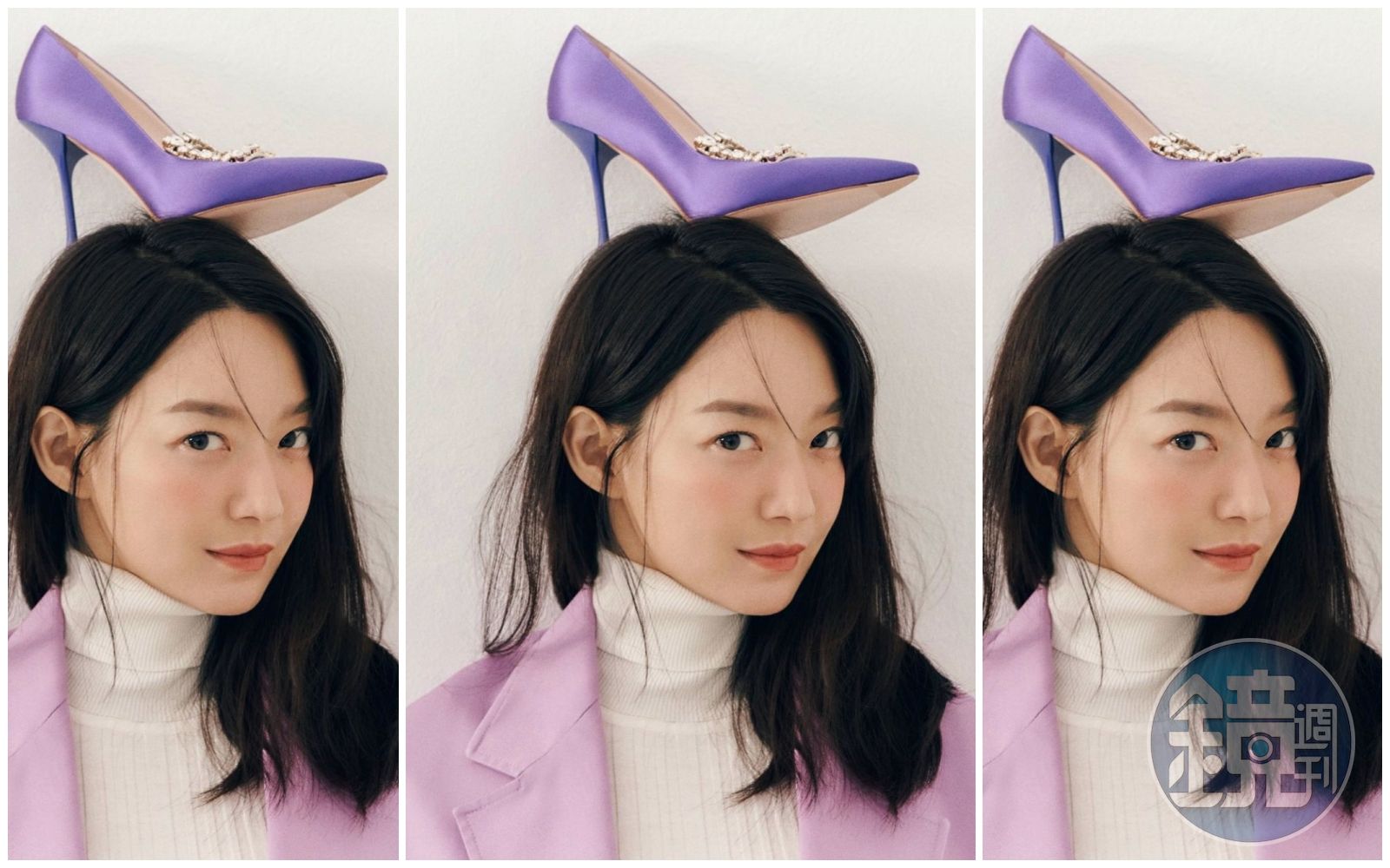 申敏兒俏皮可愛,把Roger Vivier Broche Vivier凡爾賽鑽扣系列鞋子放在頭頂上拍照。(迪生提供)發布時間:2021.02.24 00:32 臺北時間
