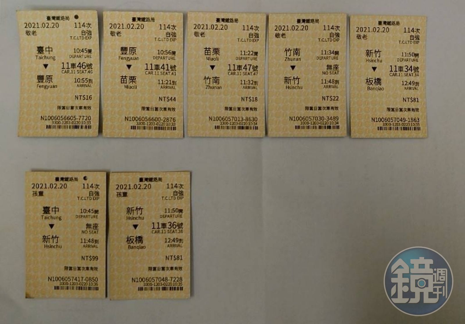 最後售票員印了7張票,還向他解說:「小孩從新竹後才有座位,阿嬤只有竹南到新竹站票,只是你們每站都換座位,新竹後就不用換了。」原PO拿到票以後仔細一看,才發現售票員花那麼多時間是在幫忙排座位,而且怕老人家不方便,位子都是排在同一車廂。