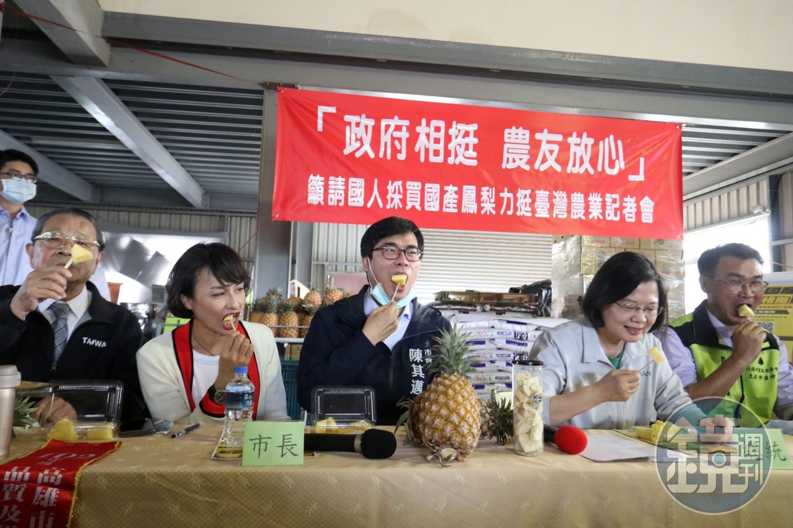 陳其邁表示,除了與台南、屏東以及嘉義等縣市合作,將台灣最好吃鳳梨外銷中國以外,也與全聯、家樂福等大型通路合作,積極行銷高雄鳳梨。另外,市府補助相關鳳梨加工、尾端清理以及水冷式採後處理設備,全力減輕農民負擔。