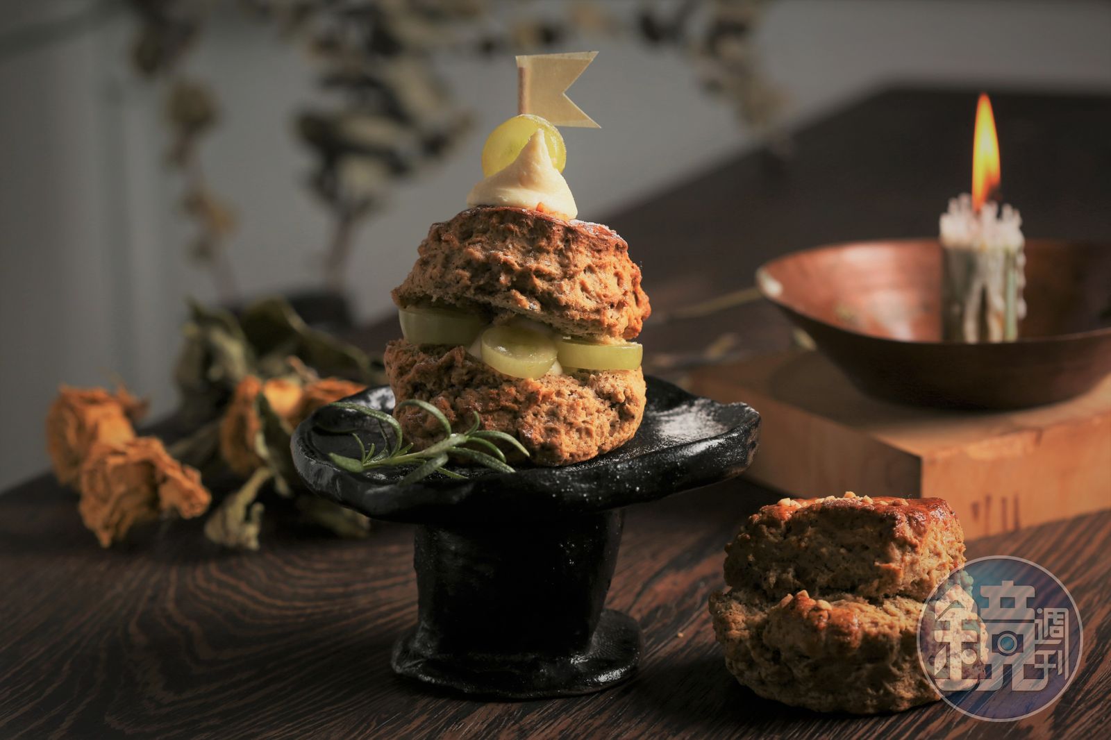 「抹茶司康」混用台灣焙茶與伊勢抹茶,略透苦味的濃厚茶香再夾入新鮮草莓,連不常吃甜點的同行攝影師都完食。