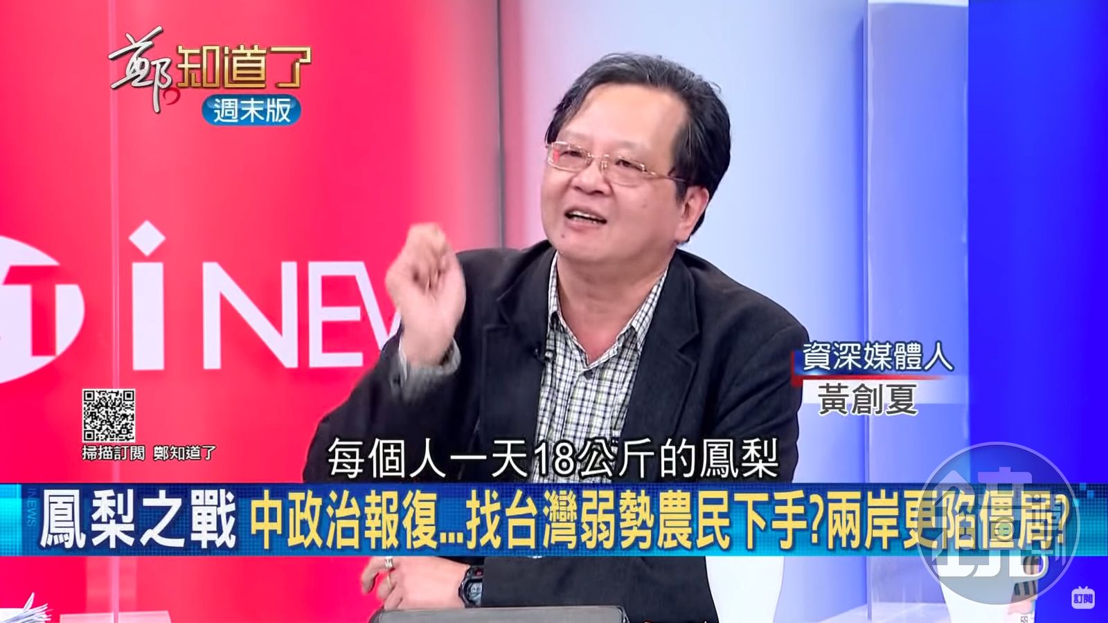 黃創夏日前在政論節目《鄭知道了》指出,以台灣2,300萬人來算,1人只要吃18公斤的鳳梨就能解決銷不出去的量,「每個人1天18公斤的鳳梨,吃個2個禮拜,很難嗎?」此番言論引起爭議,有人要黃創夏開始18公斤的吃播,也有人表示「我OK你先吃」「什麼時候貴節目表率一下開個吃18公斤鳳梨直播給大家開開眼?」
