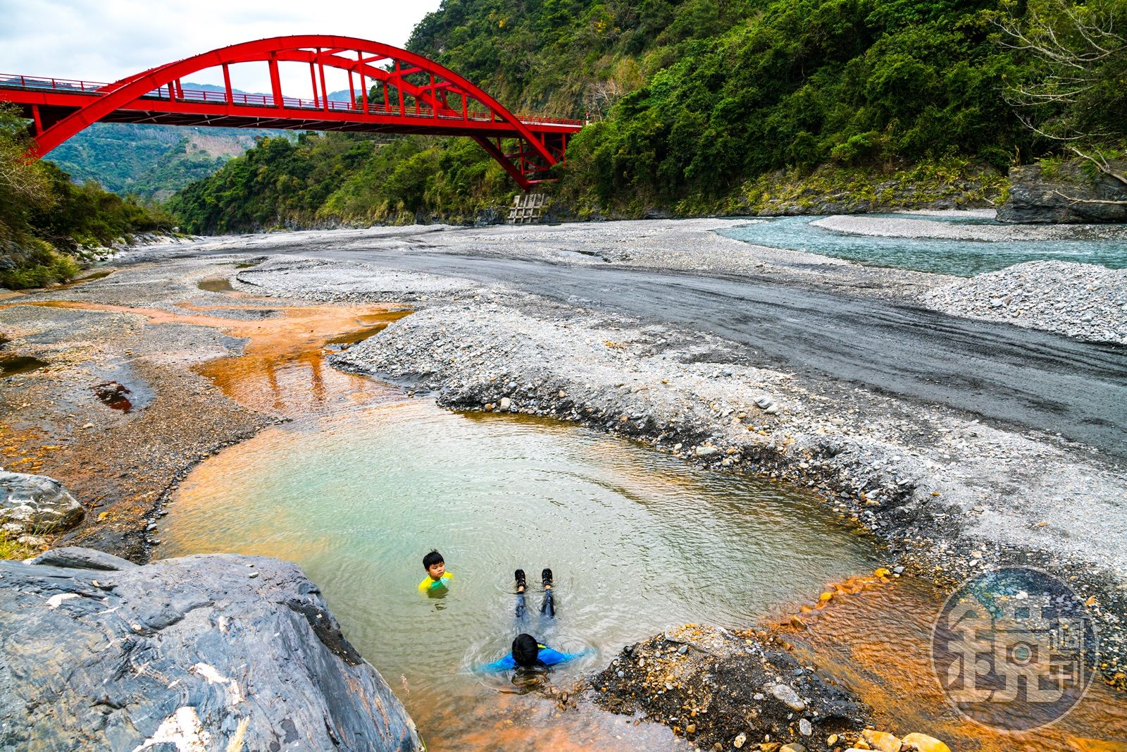 入口就位在紅葉國小下方的溪床上,只要走下樓梯,不到1分鐘的時間便到了,很難相信野溪溫泉如此容易到達,此處為溪底間歇泉,屬弱鹼性碳酸氫納泉,由於含有鐵質,溪床的石頭呈現橘紅色彩,有著大小不同的泉池,水溫也不盡相同,野外泡湯的好處是視野中只有群山的自然視野,沒有鋼筋水的屋舍,有著人與自然融為一體之感。
