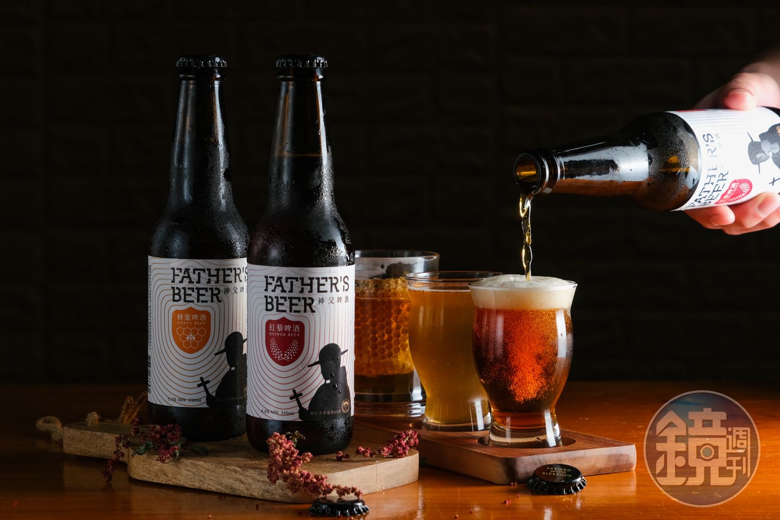 酒液偏深的紅藜啤酒,將紅藜磨碎加進麥汁裡煮,傳奇酒業老闆林晉弘說:「紅藜是一個特別的原物料,在我釀製的所有紅藜啤酒中,神父啤酒的紅藜使用量是最多的,從酒液色澤就看得出來,非常貼近紅藜的顏色。」