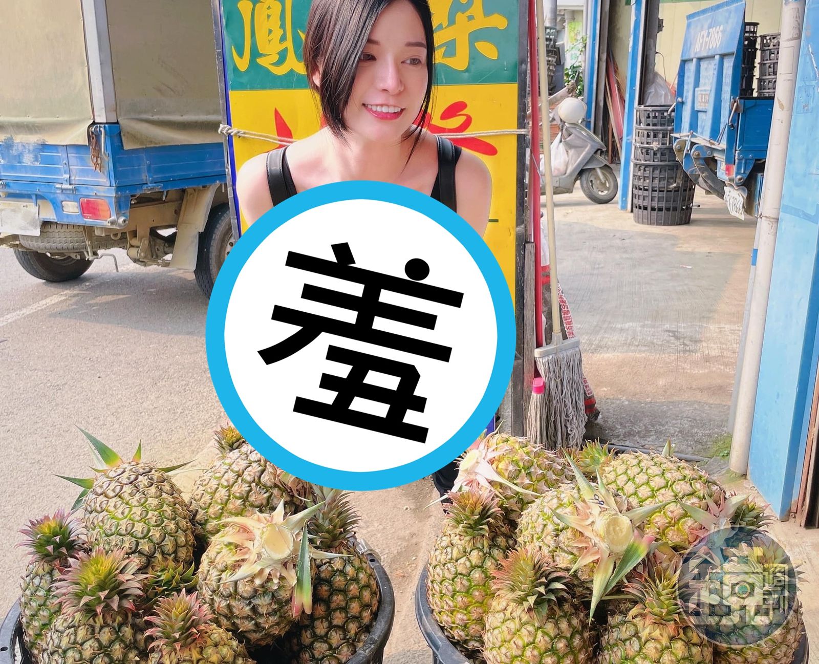 郭鬼鬼美照一出,網友們全歪樓、錯放焦點「哪個才是鳳梨?」「是牛奶鳳梨啊!」「根本沒看到鳳梨啊…」「是什麼蒙蔽了我的雙眼」「妳賣的應該是木瓜吧」美照已經引來5,000多人按讚。