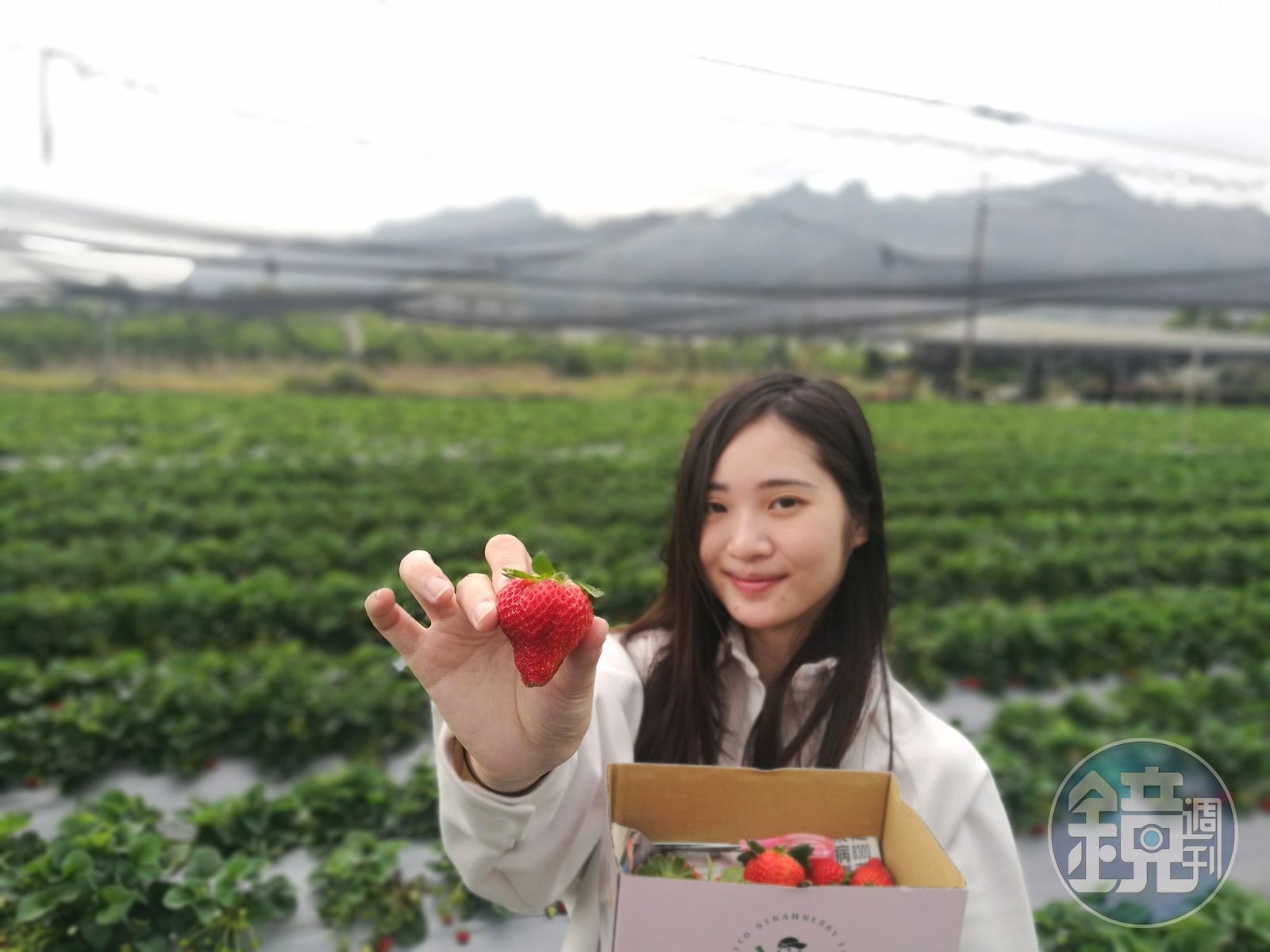 走進「納豆無毒草莓園」,遠方鋸齒狀的連綿九九峰清晰可見,走道地面鋪著天然稻殼,上方用黑網遮攔鳥兒及蟲子的攔截,園裡種有果香濃郁品種的「戀香」及「豐香」,也有好種、產量多的「香水」。