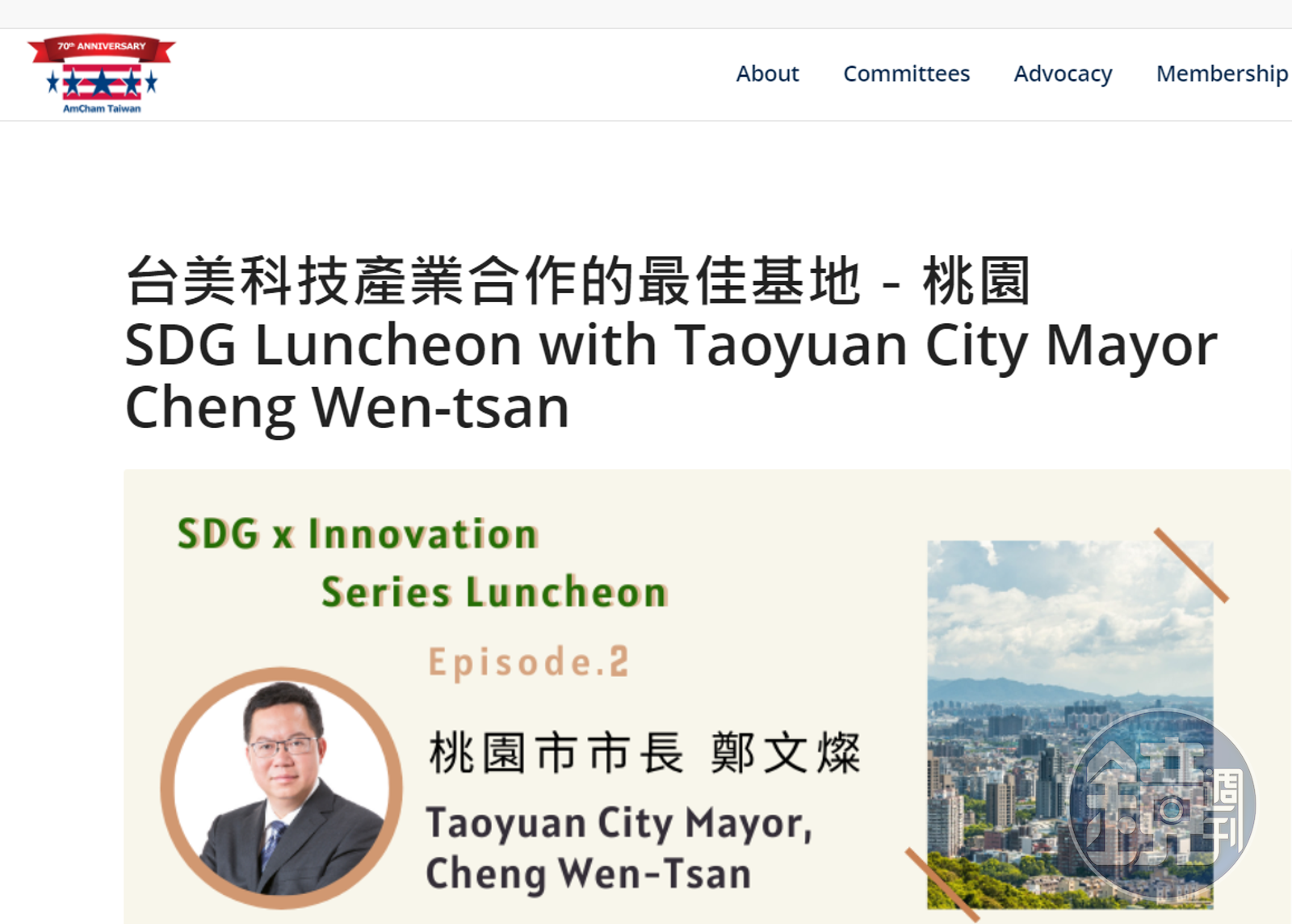 有趣的是,雖然2位都是直轄市長,但鄭文燦的午餐會演講被定義為「SDGs x Innovation」系列,而柯文哲的演講則是「Meet the Mayor」(遇見市長)系列。美國商會在官網中提及,舉辦這系列演講是因為該會去年成立SDG Committee(永續發展委員會),希望以聯合國發表的17項永續發展目標(SDGs),作為與產、官、學對話與討論的平台,因此特別以「SDGs x Innovation」為題規劃一系列午餐會,邀專業人士分享具體觀念與做法。