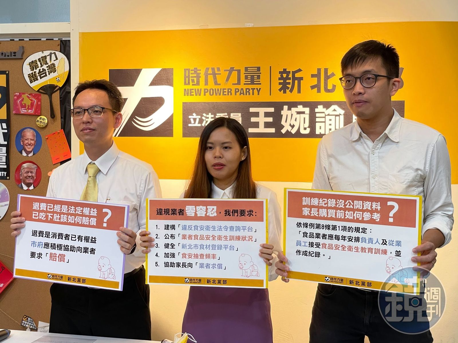 其中時代力量對食安的訴求包括,一、建構「違反食安衛生法令查詢平台」。二、公布「業者食品安全衛生訓練狀況」。三、健全「新北市食材登錄平台」。四、加強「食安抽查頻率」。五、協助家長向「業者求償」,並研擬「消費者補償機制」等5大訴求。