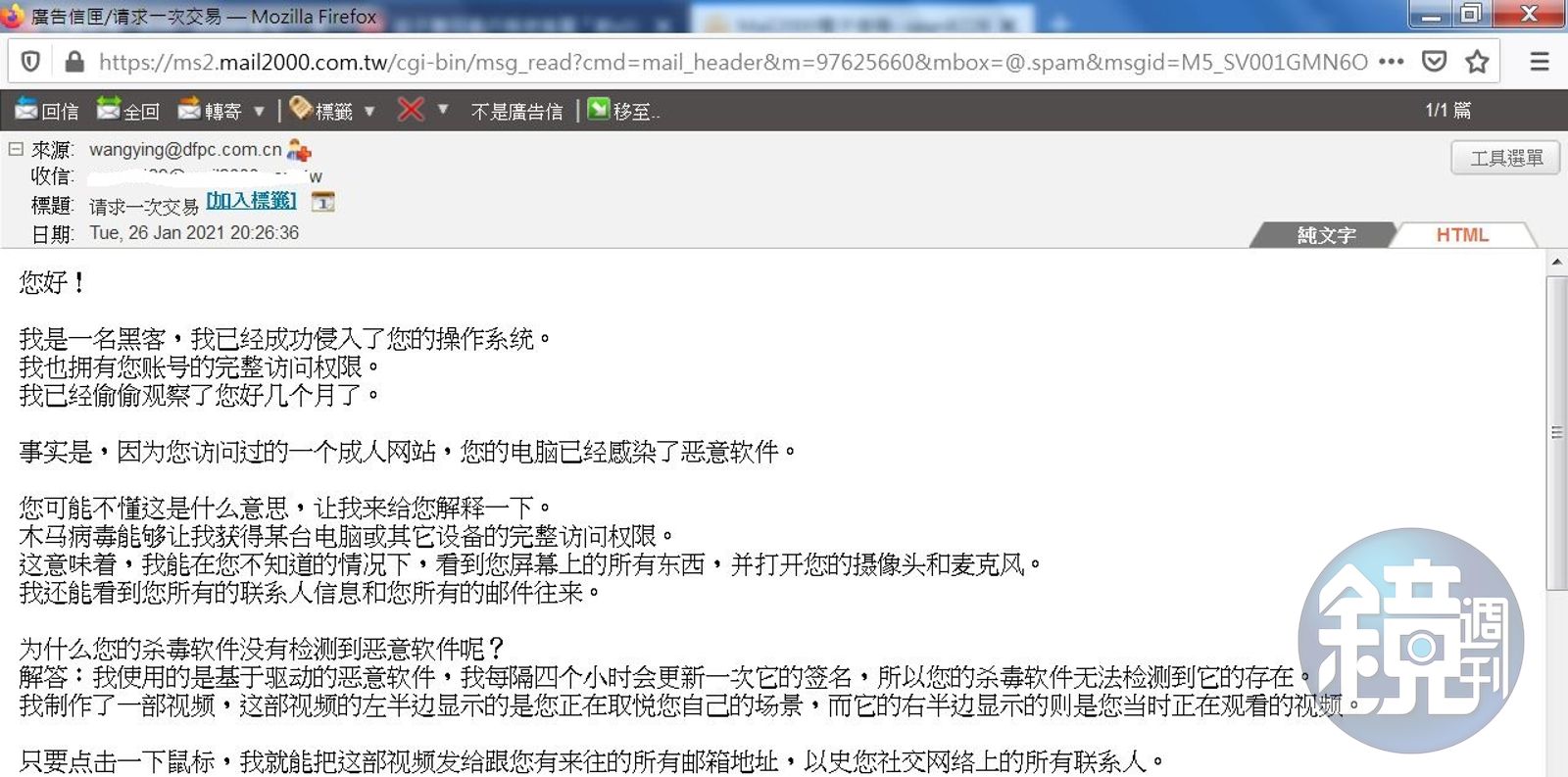 近來有民眾向警方報案,指接獲勒索電子郵件,對方用簡體字發函,內容大概是:「我是一名黑客,已經成功侵入您的操作系統,您因為訪問過一個成人網站,您的電腦已經感染惡意軟件……我能在您不知道的狀況下,看到您屏幕上的所有東西,並打開您的攝像頭與麥克風,我還能夠看到您所有聯繫人信息與郵件往來……我製作了一部視頻,這部視頻左半邊是您取悅自己的場景……」接著,威脅收信者要付多少錢,否則要將其自慰的不雅畫面遍傳所有親友,還真有被害人上過成人網站,因此心虛,交付數千元贖金後,越想越不對勁!