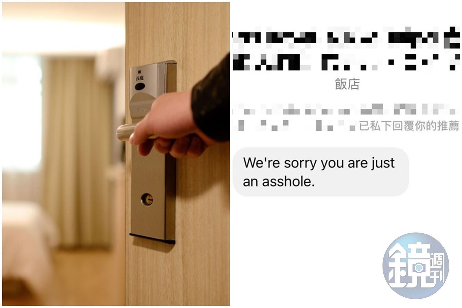 A先生接獲飯店小編回覆,竟向他辱罵「Asshole」。(讀者提供)經過反映後,A先生又接到飯店人員的澄清,解釋該訊息並非由飯店的任何網路管理員發出,目前已向警方報案備查有「駭客入侵」一事,飯店非常重視客人的寶貴意見,已經立即轉達給相關單位改進,也表示A先生下次入住時,會特別安排房間升等服務,但A先生仍難掩怒火,表示未來不會再去該飯店住宿。