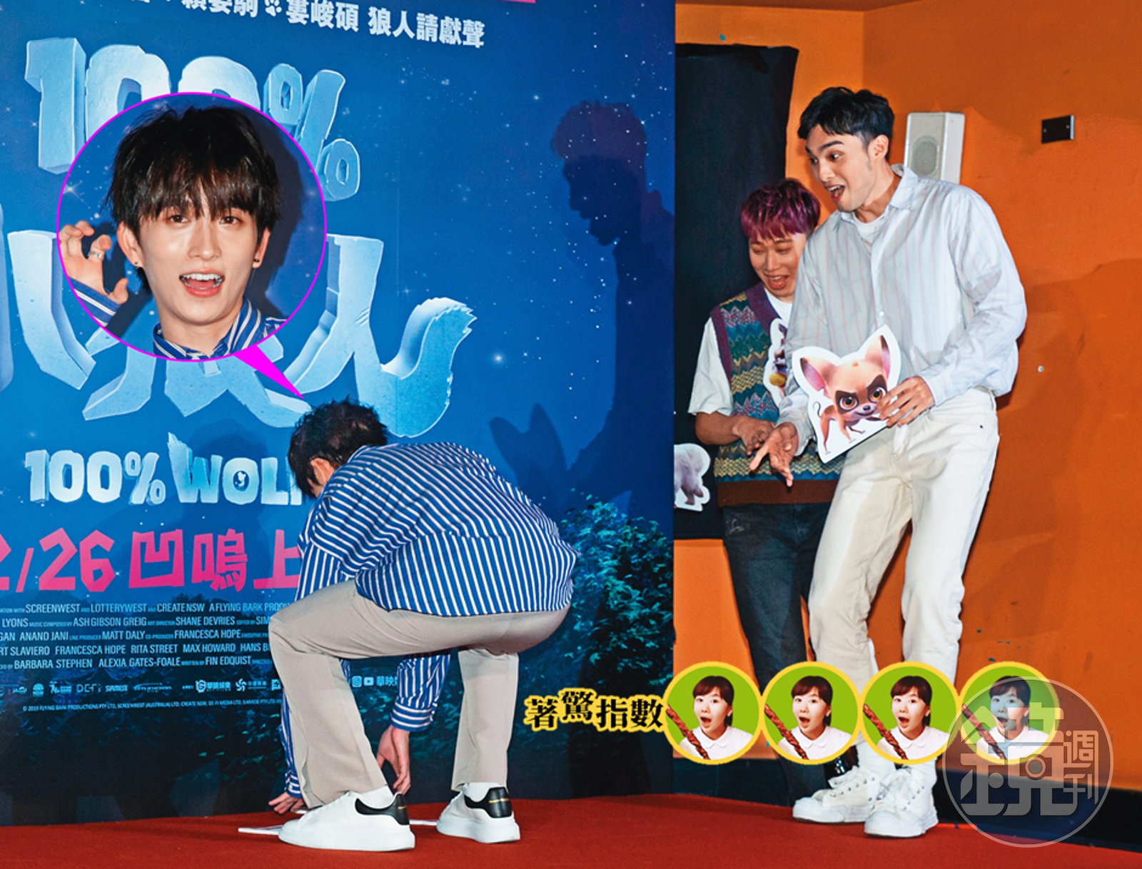 動畫《100%小狼人》舉辦首映,只見舞台上一個大屁股正對鏡頭,讓緊接而來的SpeXial主唱黃偉晉、YouTuber小賴驚呆!原來這個美尻的主人是《娛樂百分百》主持人邱鋒澤。3人為動畫配音,但邱鋒澤一上台便弄掉配音角色的造型牌,轉身撿拾才有了著驚的這一幕。近期「知識型」網紅蒼藍鴿、老高成為火熱話題,小編覺得這種「姿勢型」也美賣。(羞)(←已列入Err男名單)