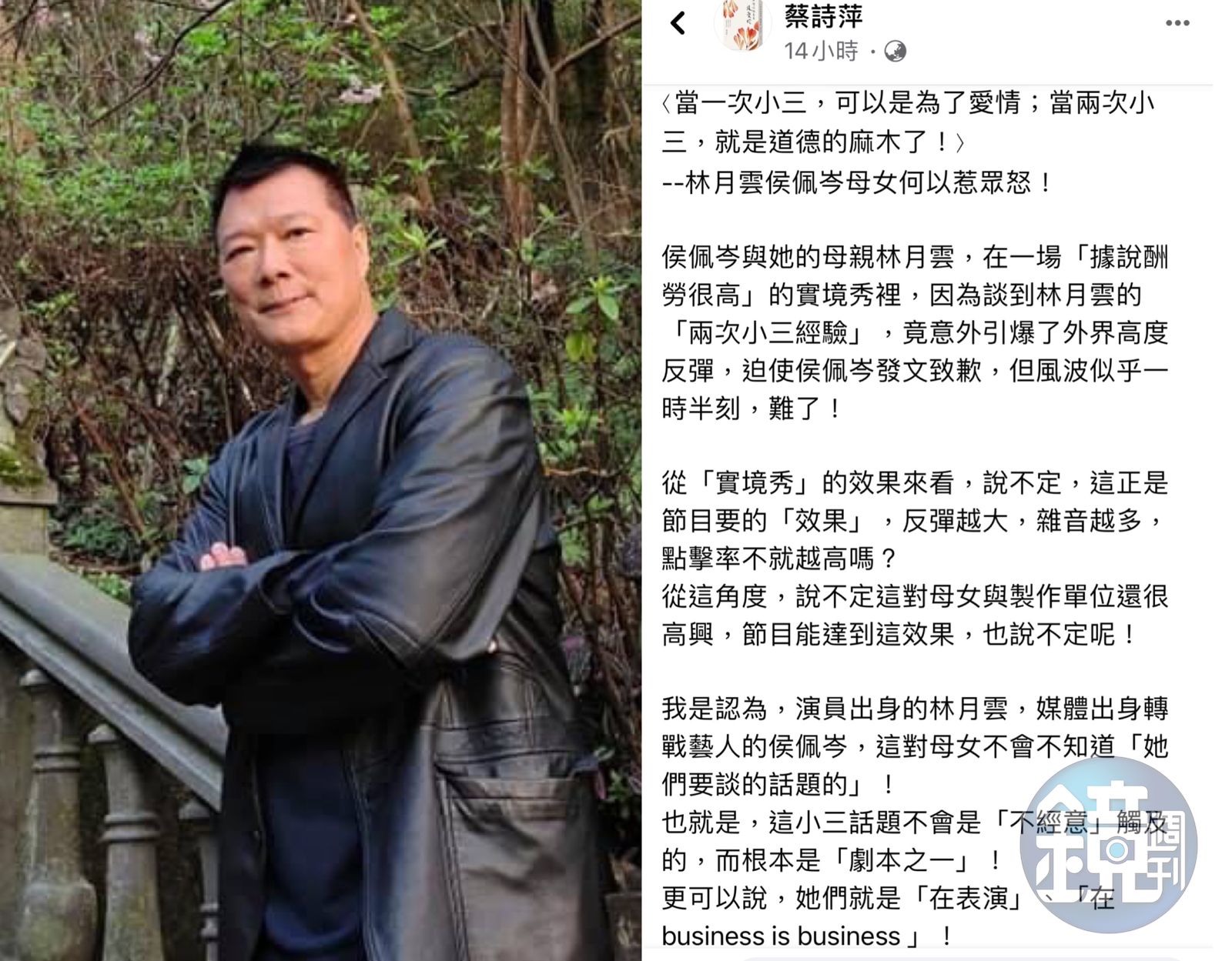 蔡詩萍自認「雖不必以清教徒的高道德標準,要求每個愛情婚姻都要善終」但也認為侯佩岑及林月雲的作法也沒有必要「淪落到要把小三故事當典範,當炫耀賺錢的籌碼」!畢竟以侯佩岑的能力,是可以讓母親林月雲過上不差的生活,讓不堪的往事「不必重提」的!
