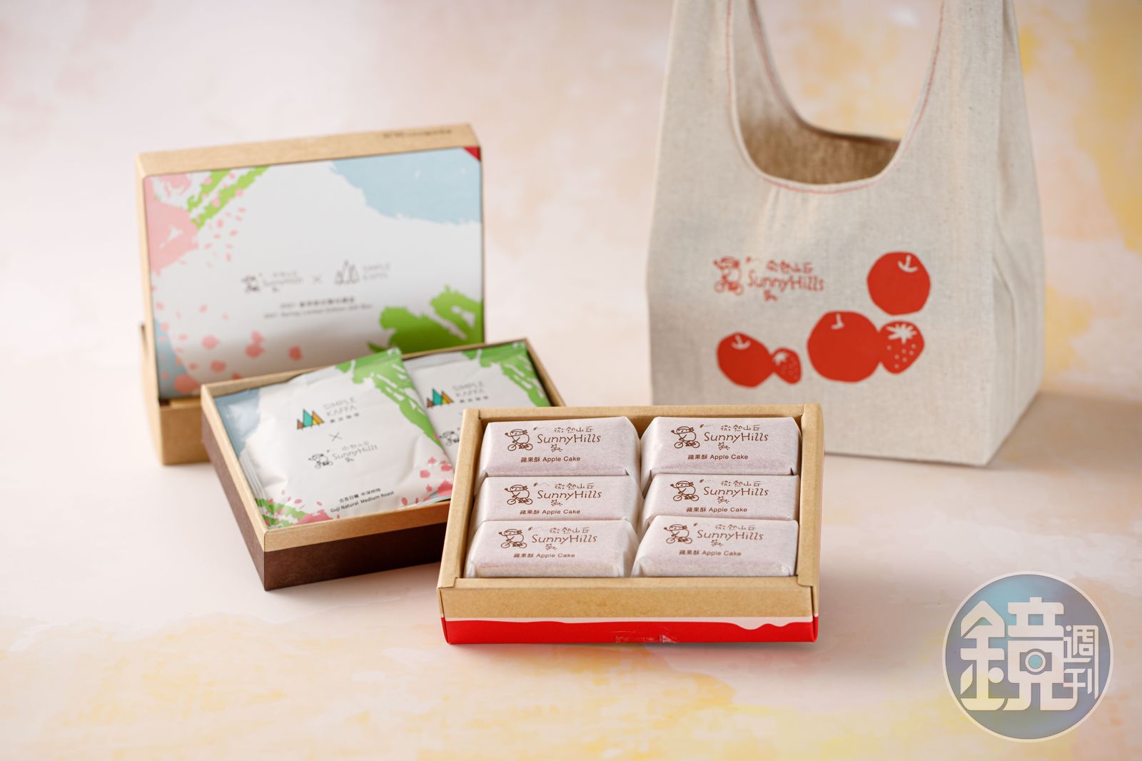 每一回微熱山丘的包裝都令人期待,這次採用堆疊設計的牛皮紙禮盒與限定布提袋,上層是草莓蘋果酥6個裝,下層是由興波咖啡創辦人吳則霖特選的衣索比亞「中深焙古吉日曬」咖啡掛耳包6包。禮盒主視覺以春櫻粉、青草綠與天空藍的潑墨抽象畫作,映襯活潑俏皮的日本紅玉蘋果與草莓,讓兩品牌首次合作的聯名禮盒,從視覺到味覺,都充滿輕鬆療癒的春季氛圍。