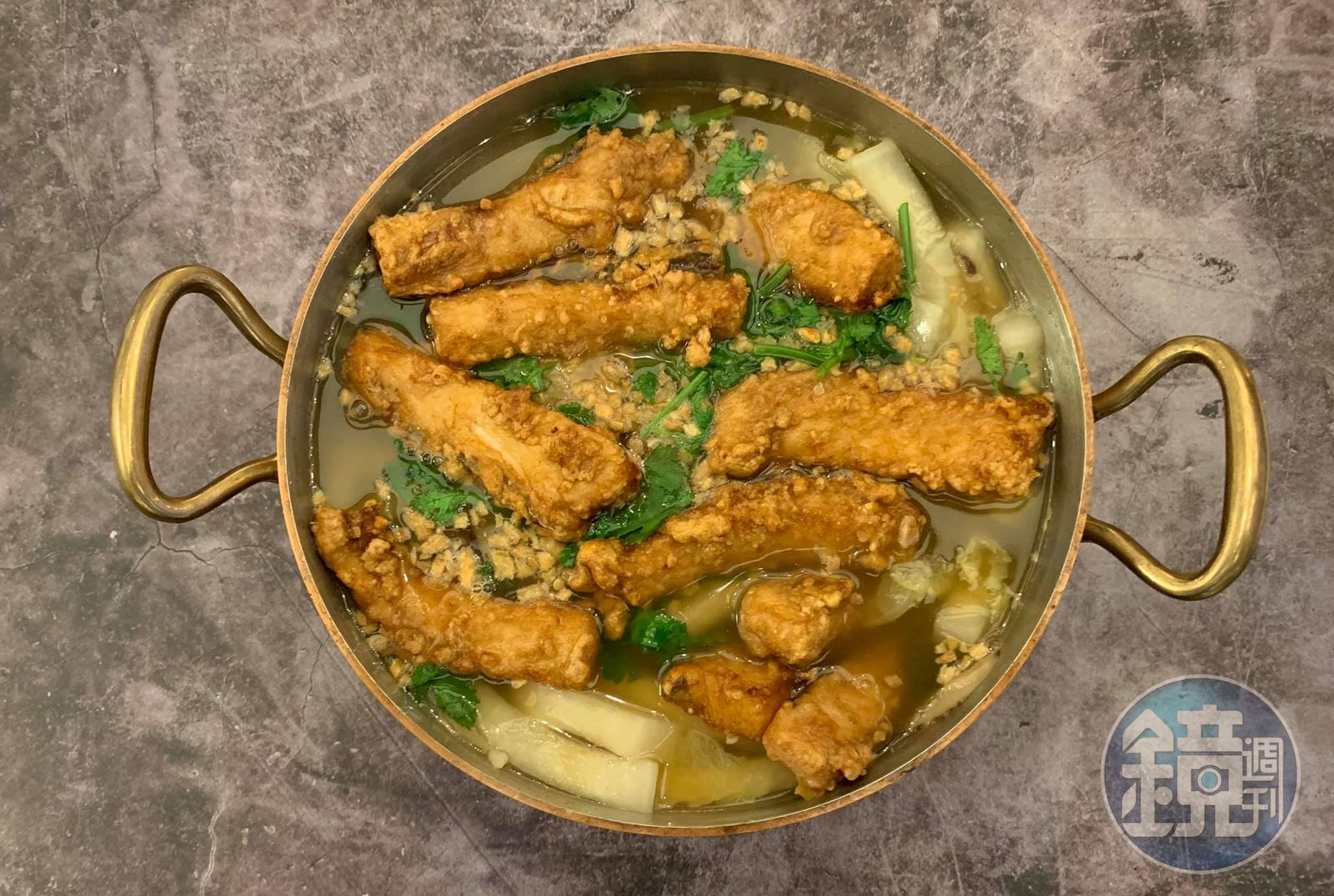 另一銅鍋,熱油起炸魚條,浮起上色,呈金黃偏咖啡色,可以,瀝油起鍋。將炸好的土魠魚浸入羹湯內,撒上大量的香菜,這就是台南的土魠魚羹,可以上桌大快朵頤一番。香菜是提味重點,當然是必須的。