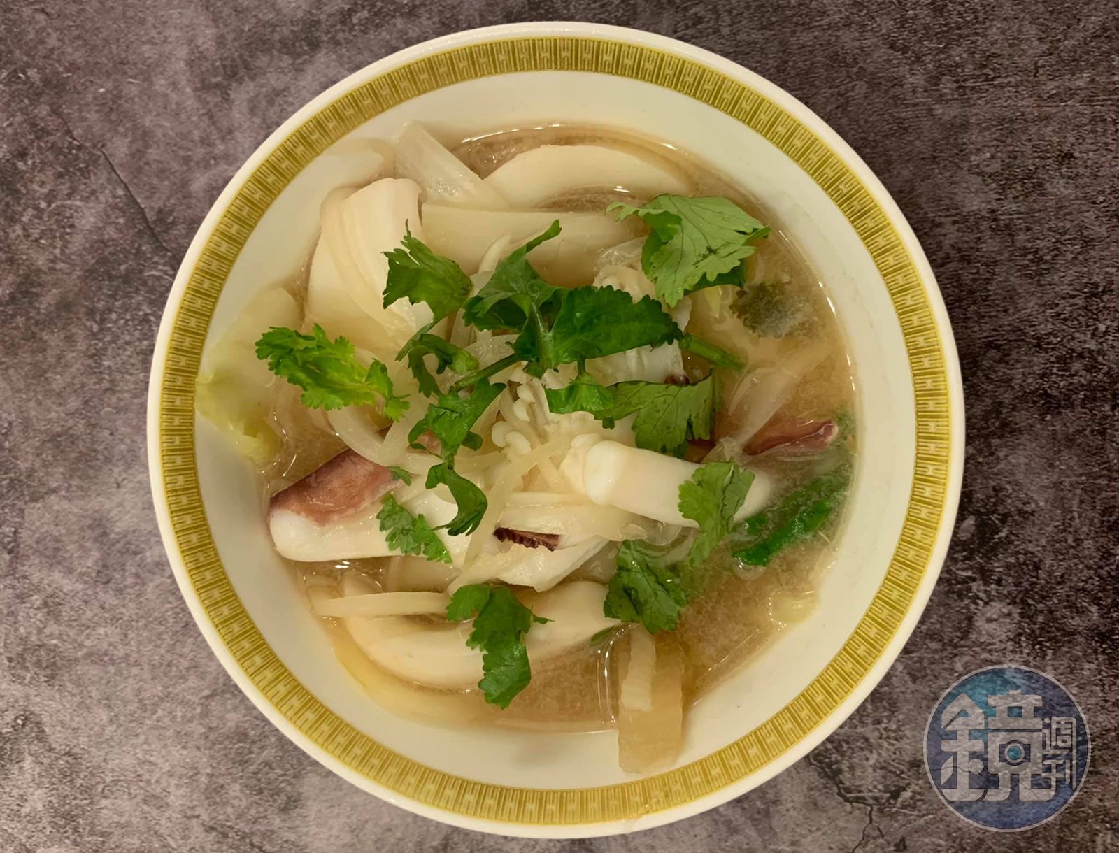 湯頭仍是柴魚高湯,先炒大白菜梗及白蘿蔔,加入柴魚高湯後燉煮到熟,加鹽、淡醬油及白胡椒調味備用,在爐火上維持羹湯的沸熱。接下來是重點:生炒花枝。