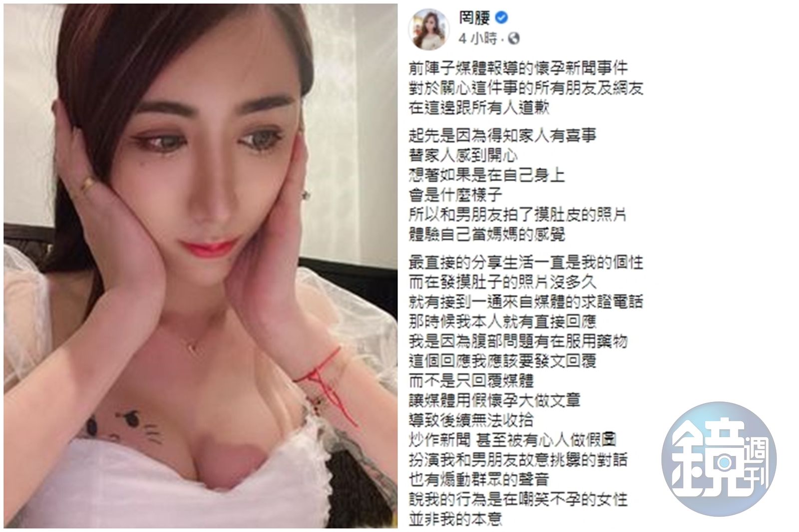 罔腰首次為連日來的風波向大眾道歉,解釋起先是得知家人有喜事感到開心,於是想著如果是在自己身上會是什麼樣子,因此和男友拍了摸肚皮的照片,體驗一下當媽媽的感覺,但仍強調是媒體用假懷孕大做文章。