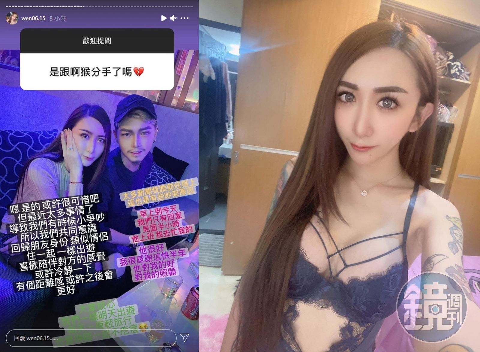 但據罔腰開心曬恩愛不過幾天,罔腰就又宣布,因為最近事情實在太多,導致兩人常常吵架,因此分手,不過還是住在一起,也會一起出去玩,罔腰也向本刊坦承,因為假孕風波,自己在網路上銷售商品的業績大受影響,至於真實的感情狀況如何,也因罔腰在假孕事件上說謊,誠信已經大打折扣,真相恐怕只有他們兩人才能定奪。