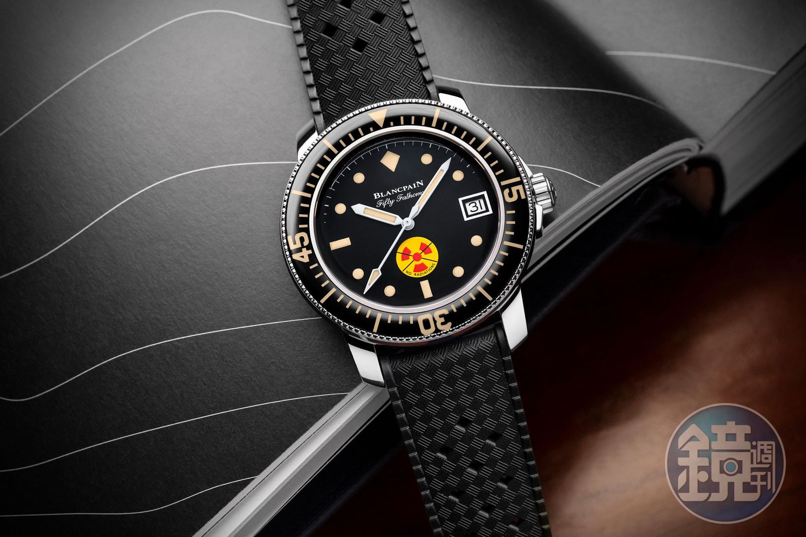 我們知道早期手錶中會運用鐳來作為指針與刻度上的夜光塗料,然而這個放射性元素後來被證實危害健康,因此陸續由銪(Europium)或氚(Tritium)所取代,到近代最常使用的則是Super-Luminova。當年,寶珀為了向宣告自家的產品不再使用具備鐳的發光材料,因此在1960年代中期推出的一款特殊的五十噚腕錶,型號為Fifty Fathoms RPG 1,也被稱做「BUND No Rad」,它是由德國軍隊與其他軍隊所購入的特殊錶款,在面盤6點鐘位置放上這個輻射圖案,再劃上一個大大的叉,並寫下No Radiations字樣。