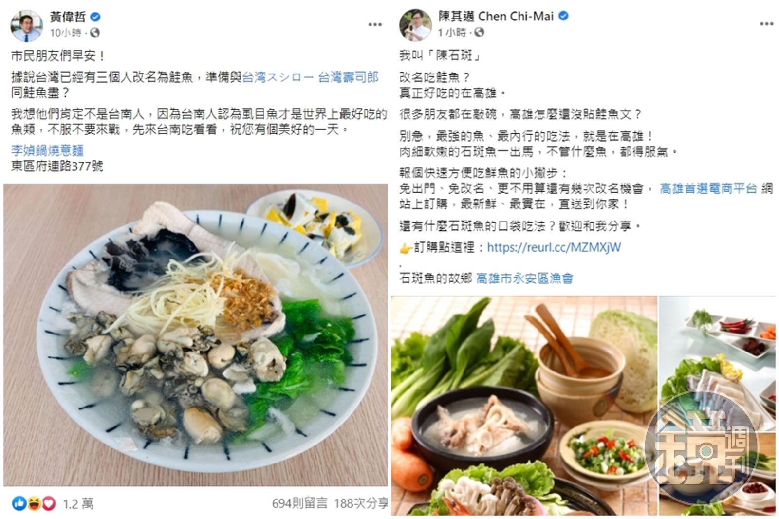 全台掀鮭魚之亂,台南市長黃偉哲力推虱目魚(左圖)、高雄市長陳其邁推薦肉細軟嫩的石斑魚(右圖)。(翻攝自黃偉哲、陳其邁臉書)發布時間:2021.03.17 17:50 臺北時間