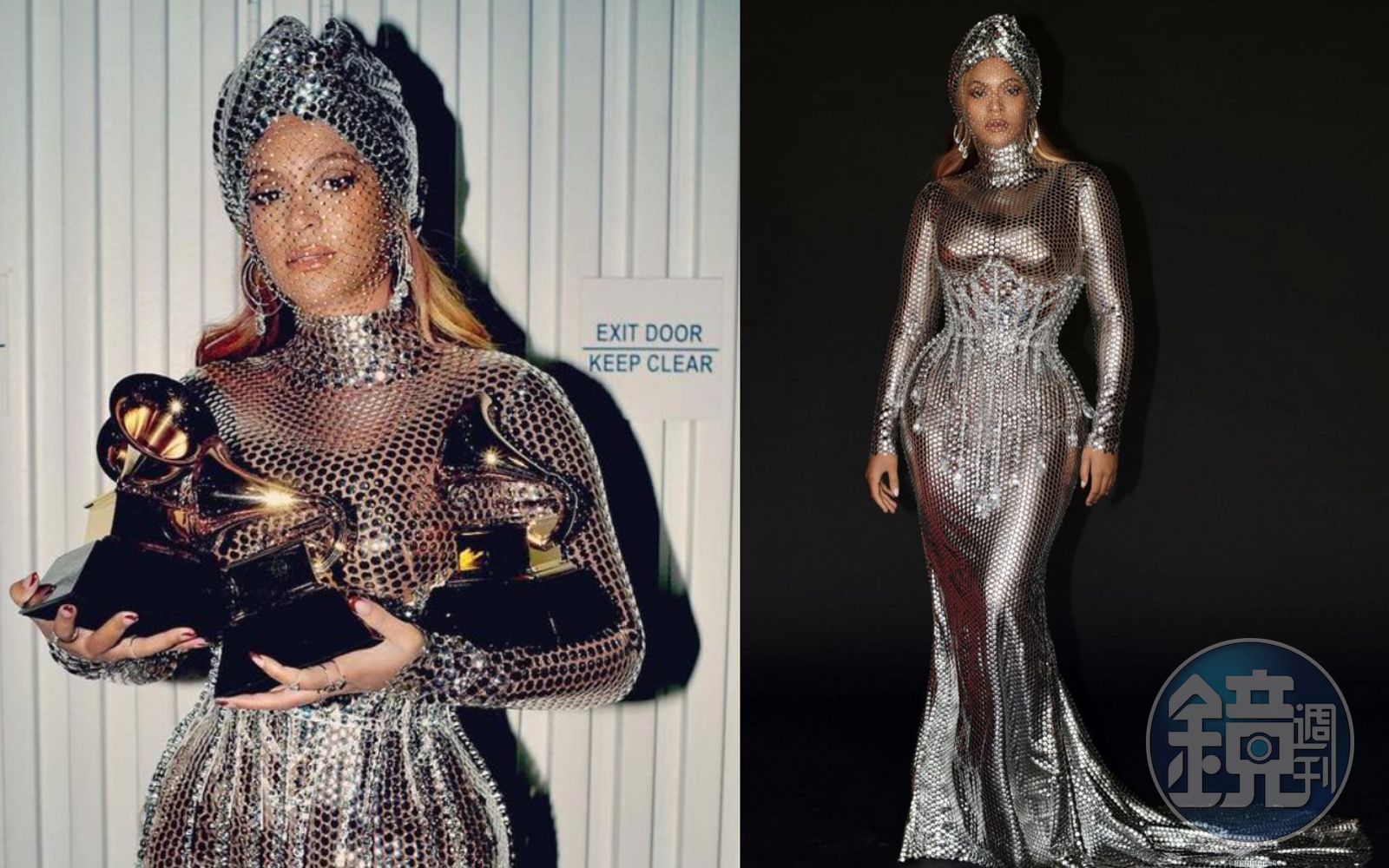 以往談到Burberry這個英倫百年品牌,許多人會想到經典風衣,在Riccardo Tisci接手後,注入了許多不同以往的街頭與高訂風格。在葛萊美獎的會後晚宴,碧昂絲的這套訂製禮服全身鑲滿如蟒蛇皮紋的銀釘,最特別的是搭了類似阿拉伯傳統頭巾帽,同樣以銀釘裝飾,而水鑽交織而成的面紗更讓她展示一種神祕感與霸氣。