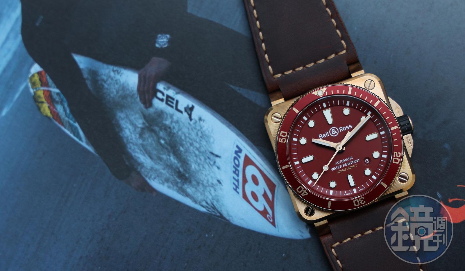 BELL & ROSS在2018年首度發表BR 03-92 Diver青銅款,是以2017年發表的BR 03-92 Diver基礎下換成青銅材質,造型跟線條的辨識度極高。後來品牌開始延伸出許多不同的面盤顏色,2018年是黑色、2019年是綠色,到2020年的藍色版本,嘗試與青銅材質激盪出不同的視覺效果。更換面盤顏色聽起來好像沒什麼難度,但要拿捏中間的色調就是一門學問,像是BELL & ROSS在BR 03-92 Diver青銅款在顏色上選得都很好,彩度偏暗一些,與青銅最初的顏色配起來不會太搶眼,但又保有自己的性格,視覺效果非常討喜,包括這次全新的「勃根地酒紅」也是同樣的操作。