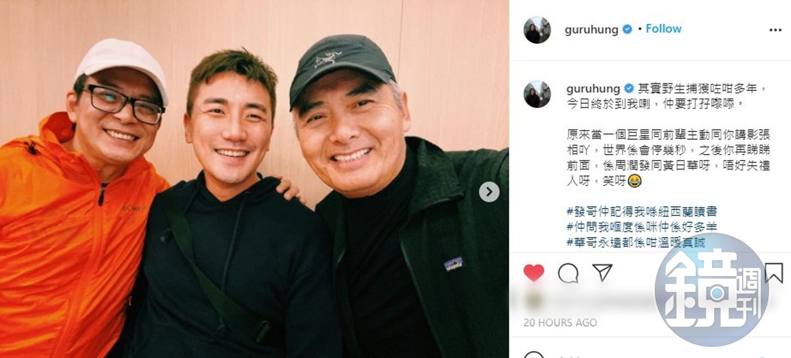 37歲的港星洪永城透過IG曬出與演藝圈大前輩周潤發、黃日華的同框照,感動表示大家都「野生捕獲」周潤發,這一次終於輪到自己。洪永城透露身為世界巨星的周潤發,主動表示一起合影,讓他「世界停幾秒」,當意識到站在自己面前的人是周潤發和黃日華時,只能提醒自己「不好沒禮貌呀,笑呀。」