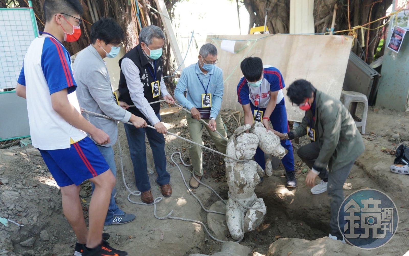 因為公園範圍過大,鄭詠仁決定先前往北港朝天宮向媽祖擲筊請示,而媽祖也提供了某處「定位」,於是鄭詠仁帶著學生們前往該地開挖。沒想到奇蹟就這麼發生,一行人第一鏟就挖到塑像底座,更在往下1公尺處挖出了《美人倒水》雕像本體,鄭詠仁對此奇蹟表示「因為沒有科技的輔助,所以這一切就是相信我們的信仰」。