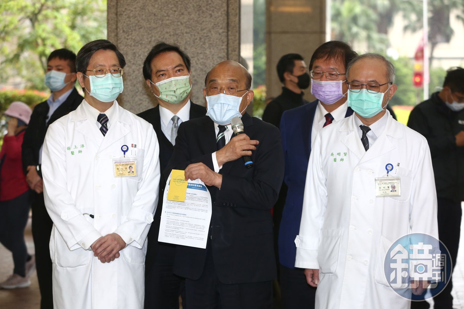 蘇貞昌與陳時中為了讓國人能夠安心接種AZ疫苗,因此今日一早就前往台大醫院施打「全台第一針」,完成接種後,蘇貞昌接受媒體訪問稱,施打完拿到一張卡,讓他在一定時間再去注射第二劑,接種部位於左手臂上,沒有任何疼痛感、身體也無痠痛感,經過30分鐘的休息狀況良好,沒有任何不適、也無發燒。