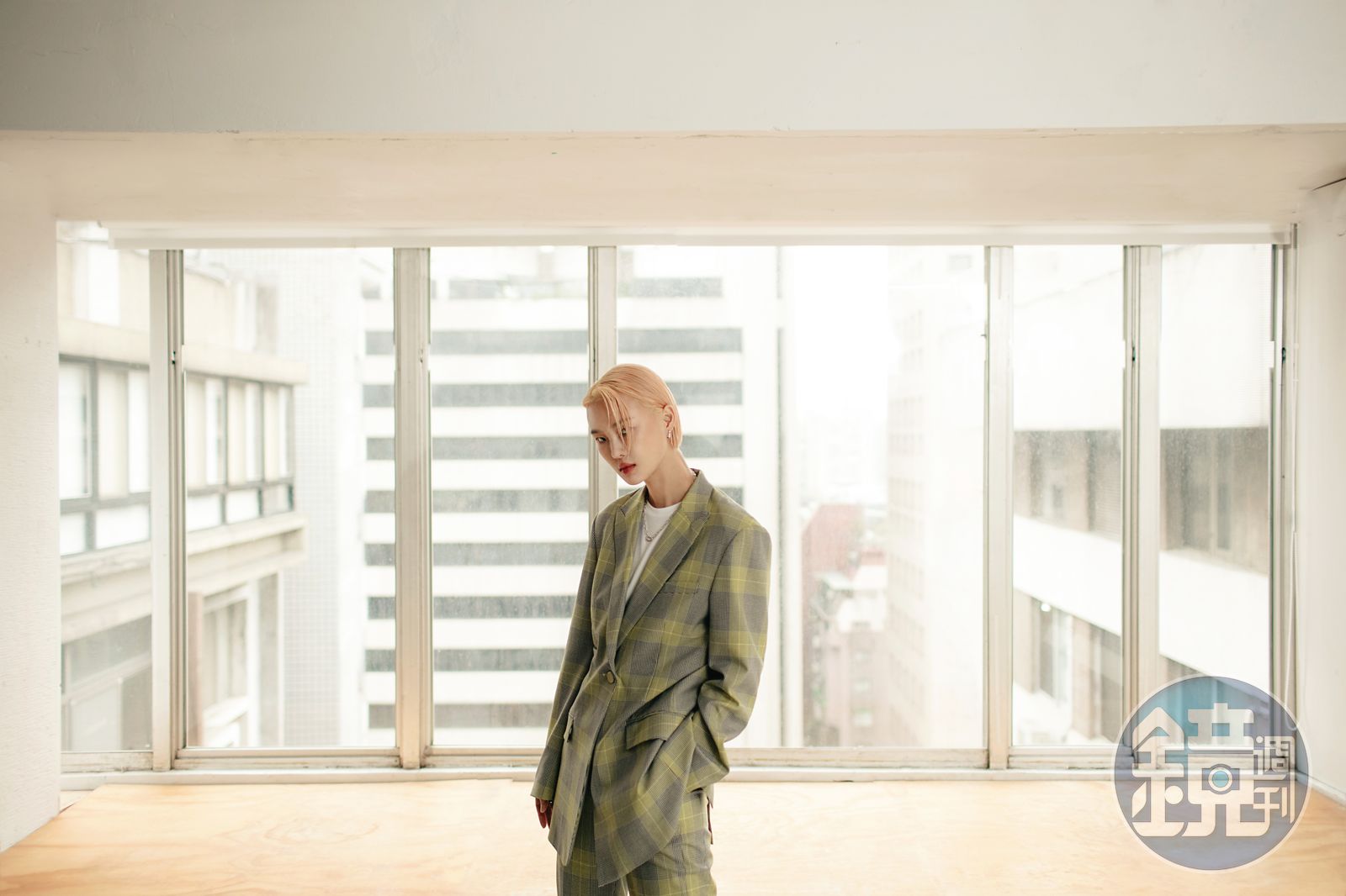 淺灰黃格紋西裝外套 價格店洽by PortsPure/淺灰黃格紋西裝褲 價格店洽 by PortsPure/白色無袖上衣 NT$13,000 by BRUNELLO CUCINELLI/銀色環釦耳環 NT$2,500 by APM MONACO/銀色鎖鏈項鍊 NT$5,700 by APM MONACO