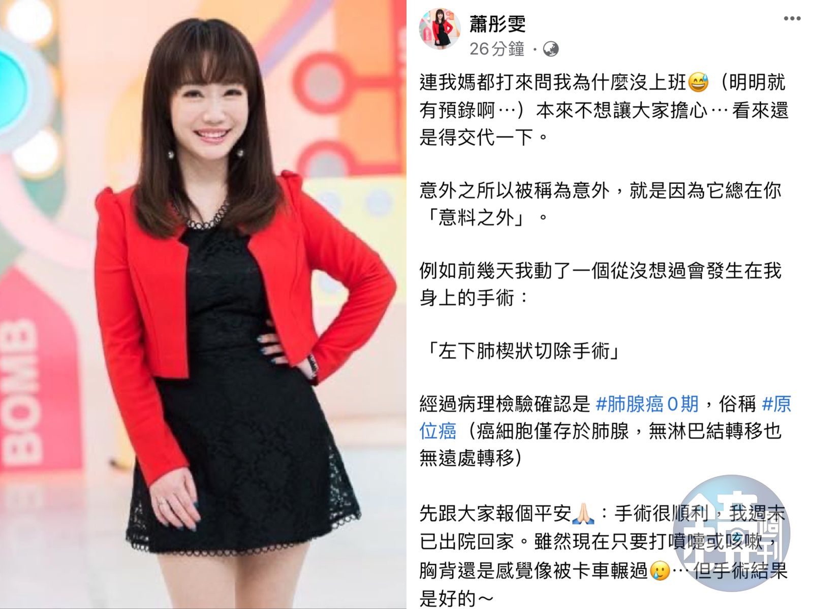 蕭彤雯今早約莫11點突然在自己的臉書貼上一張自己坐在病床上照片,她透露今年年初到醫院做健檢,意外發現自己左肺葉有一顆0.9公分大小的陰影,是醫生比較不樂見的「毛玻璃狀結節」,隨後轉診至北榮進行進一步檢查,於上週(16)日完成「左下肺楔狀切除手術」,並在上週末返家休養。