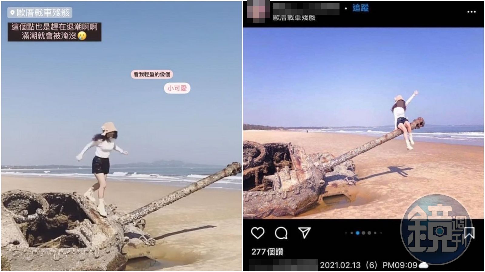 一名網友匿名於「Dcard」論壇上貼出一名網美的Instagram的截圖,並以「網美破壞戰地遺跡」為題發文,從截圖中可見一名年輕女子到金門歐厝海灘上遊玩,卻坐到戰地遺跡「沉睡戰車」砲管上,手舉高對著鏡頭甜笑。網友還貼出該名網美的限時動態截圖,指其爬到戰車上時還自稱「看我輕盈的像個小可愛!」,目前已找不到相關貼文,疑似皆被移除。