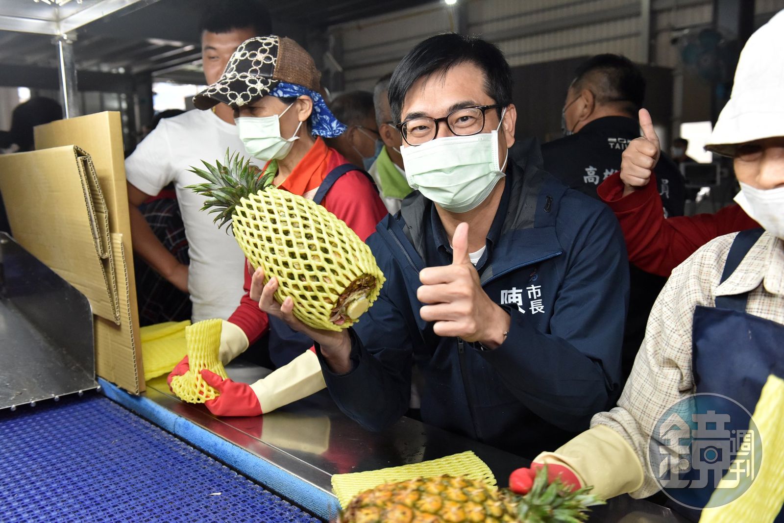 陳其邁昨天見證第一批海運首發韓國16.8公噸的金鑽鳳梨封櫃,預計每週出1櫃,至5月底將可輸出韓國超過100公噸,這些鳳梨將在韓國知名的Galeria、現代等高級百貨公司上市。