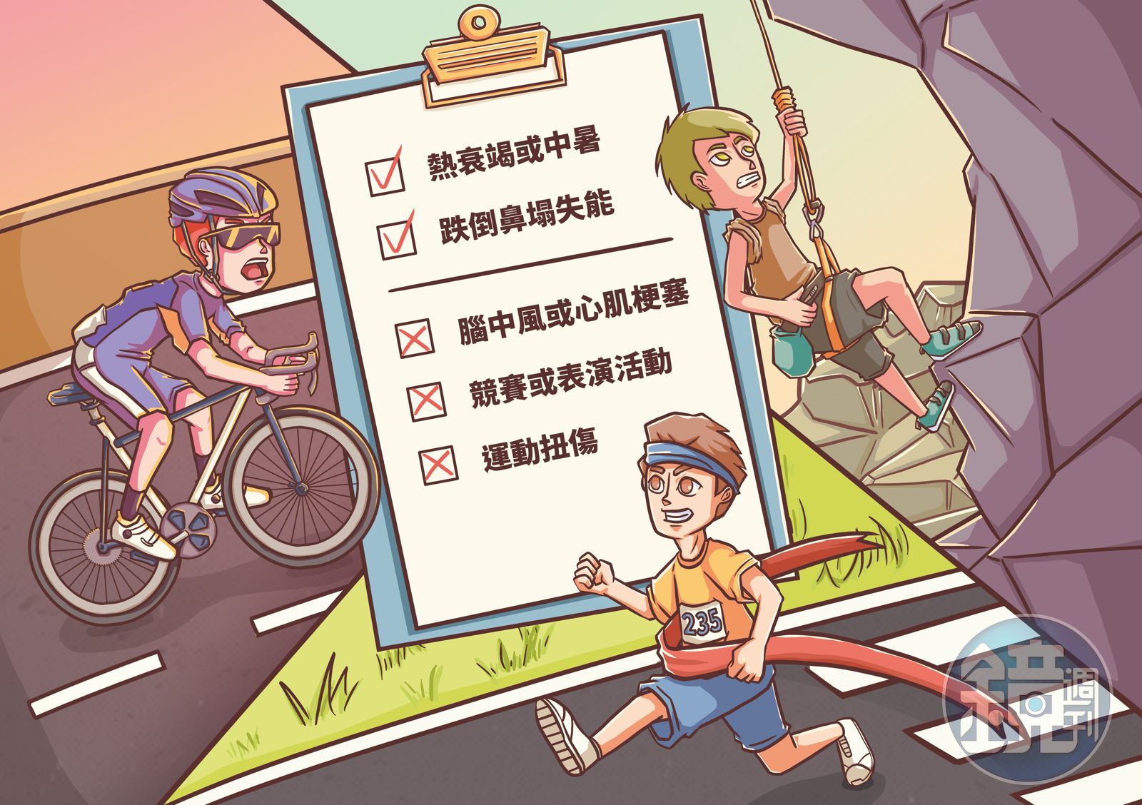 另外,鐵人三項競賽也是熱門運動,比賽包括游泳、自行車和長跑三項,「自行車競賽是意外險不保的事項,但游泳和長跑則沒被列入,理論上,如果不是在自行車競賽項目中發生意外事故,都會賠,但目前實務上較少看到鐵人三項的爭議案例。」洪令家表示。