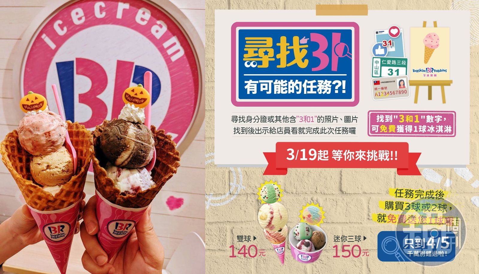 「31冰淇淋」近日推出「尋找31,送你冰淇淋」的優惠活動,條件是只要尋找身邊任何含有3和1兩個數字的圖片、照片或物品出示給店員看,並且購買小雙球或是迷你3球的冰淇淋,就可以免費獲得再加1球的優惠,像是只要身分證字號中同時含有3和1的民眾即過關,而此優惠活動從19日開始將一直到4月5日為止。