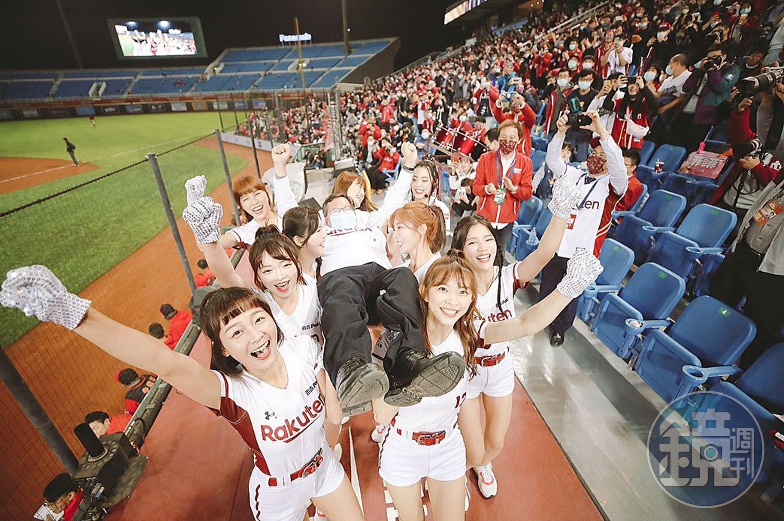 樂天女孩們合力扛起鄭文燦,引起鄭文燦的體重之謎。(翻攝自伊伊IG)發布時間:2021.03.24 16:37 臺北時間