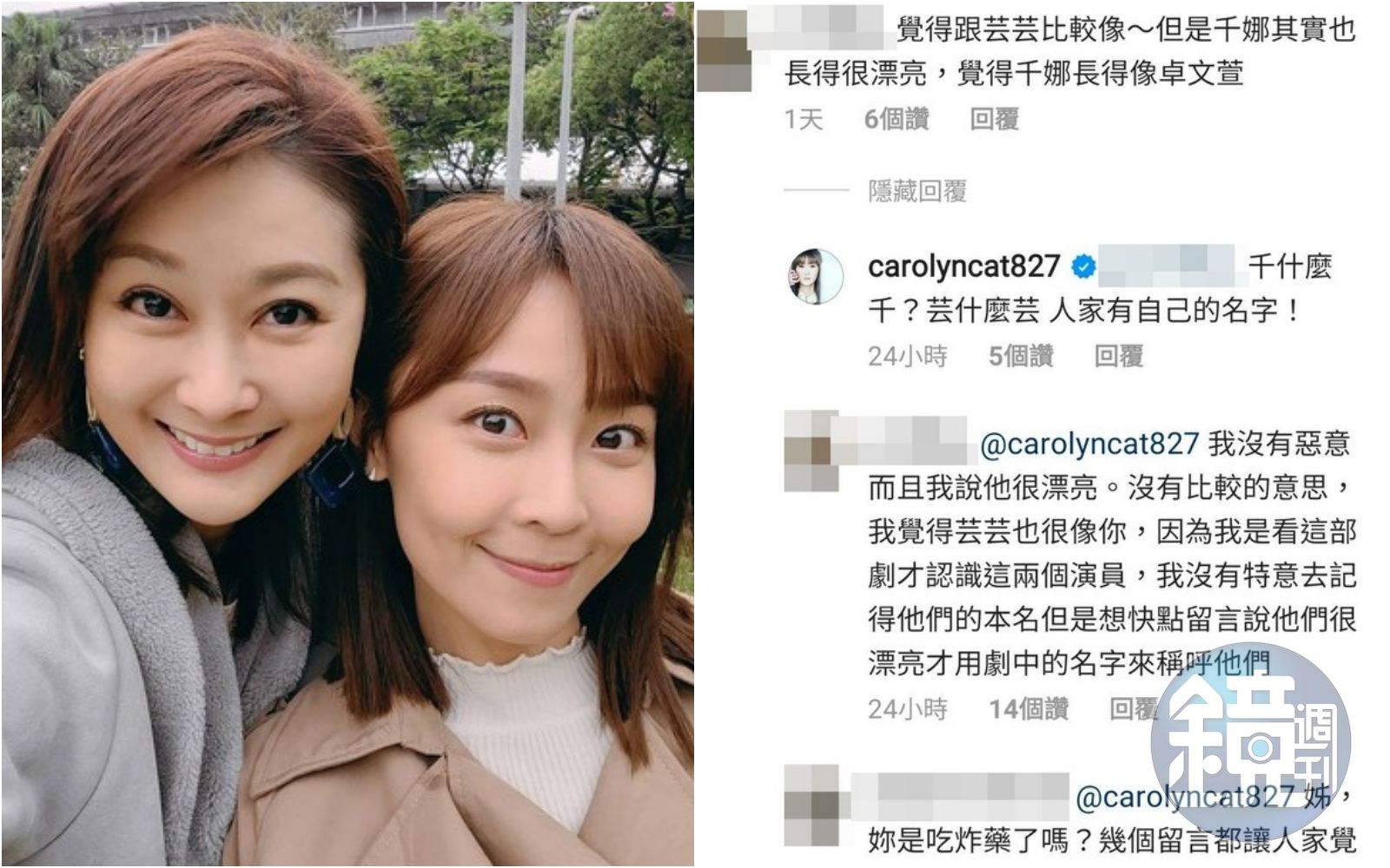 陳珮騏分享和林昀希的照片,寫著「其實面對面看著時,真心覺得我們倆長得像耶!」有粉絲留言回應:「覺得跟芸芸比較像~但是千娜其實也長得很漂亮」,但陳佩騏不滿粉絲稱呼劇中名字,直接糾正說:「千什麼千?芸什麼芸,人家有自己的名字!」