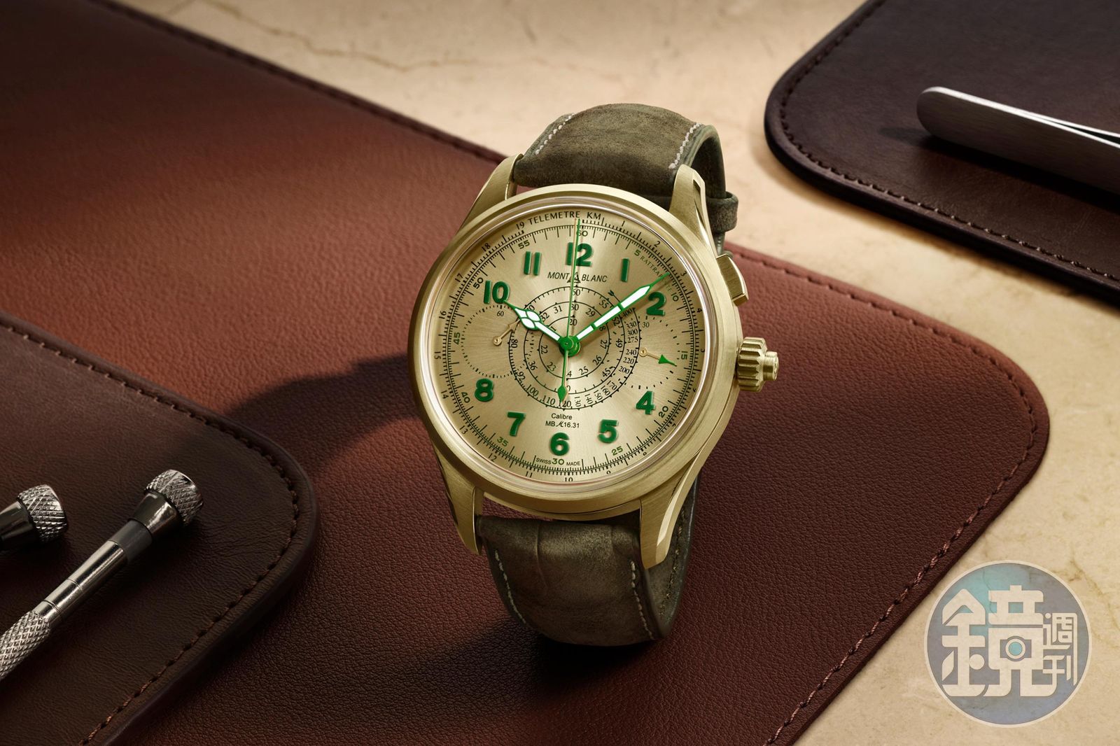 面盤與萊姆金錶殼做了相同的顏色,指針與刻度也打趣地以綠色為主軸搭配金色點綴。夜光教堂式時針和分針、分鐘刻度環、中央追針、測速儀與測距儀,以及位於12點鐘位置的舊式萬寶龍標誌,面盤空間分配游刃有餘,正面或背面都一樣精彩。